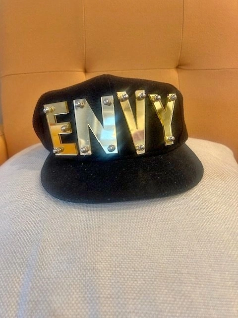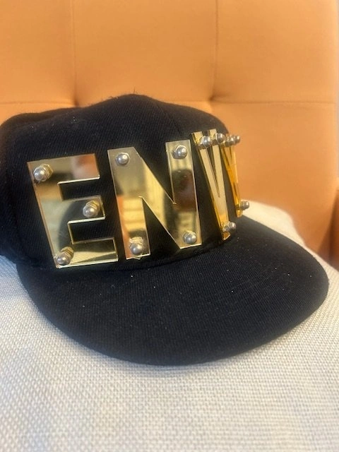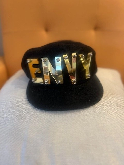 Retro style cap with ENVY gold letters. The letters are secured with fashion studs for an edgy streetwear look. Adjustable snapback closure. Great for festivals, concerts, hip-hop fashion, dance crews, costumes, or stylish everyday wear. Used briefly for movie set. Pick up Port Moody or UBC.