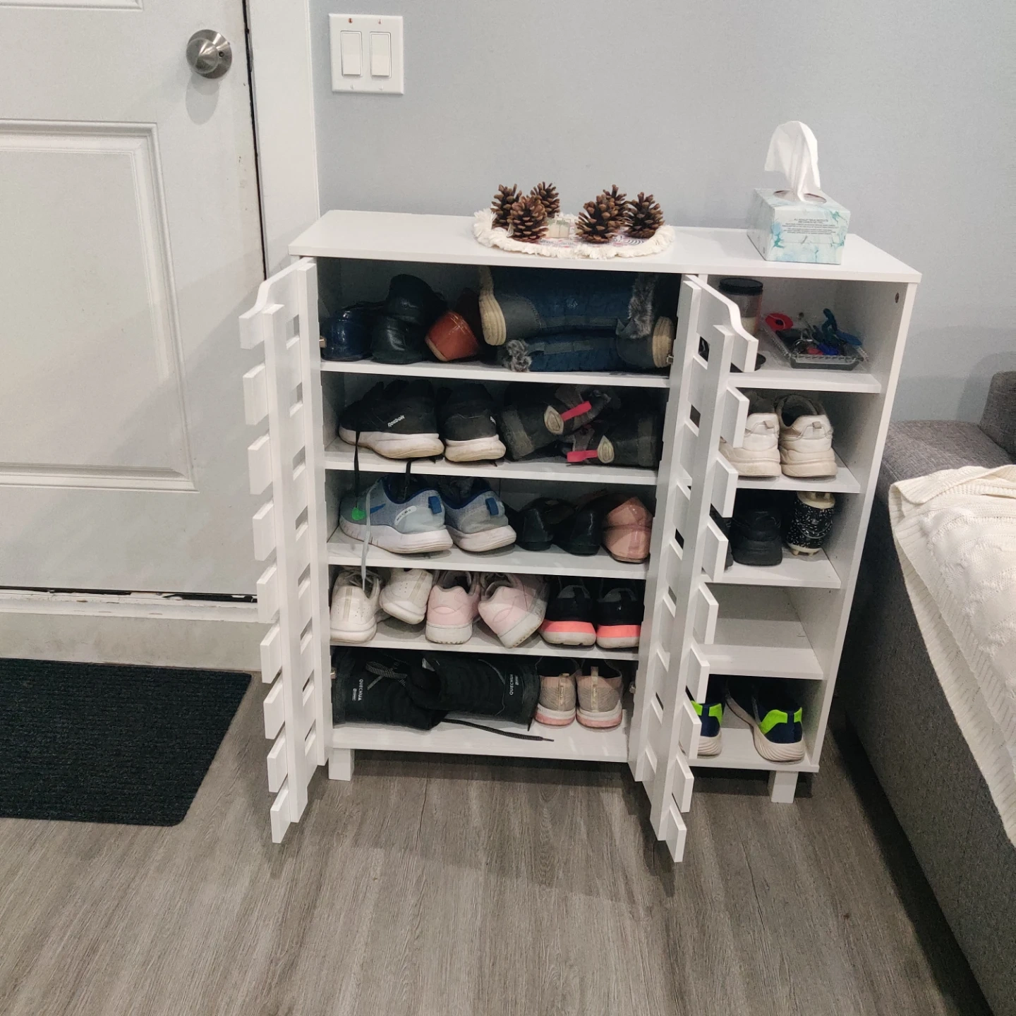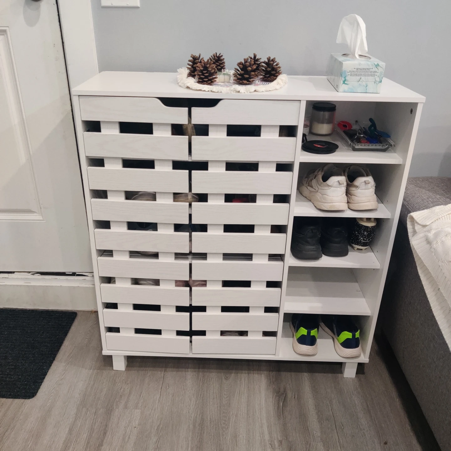 This white shoe rack cabinet offers ample storage with its 8 tiers and slatted doors for ventilation. It's great for organizing footwear in your entryway or closet. The cabinet features a top drawer for small items and a side open shelf for quick access.