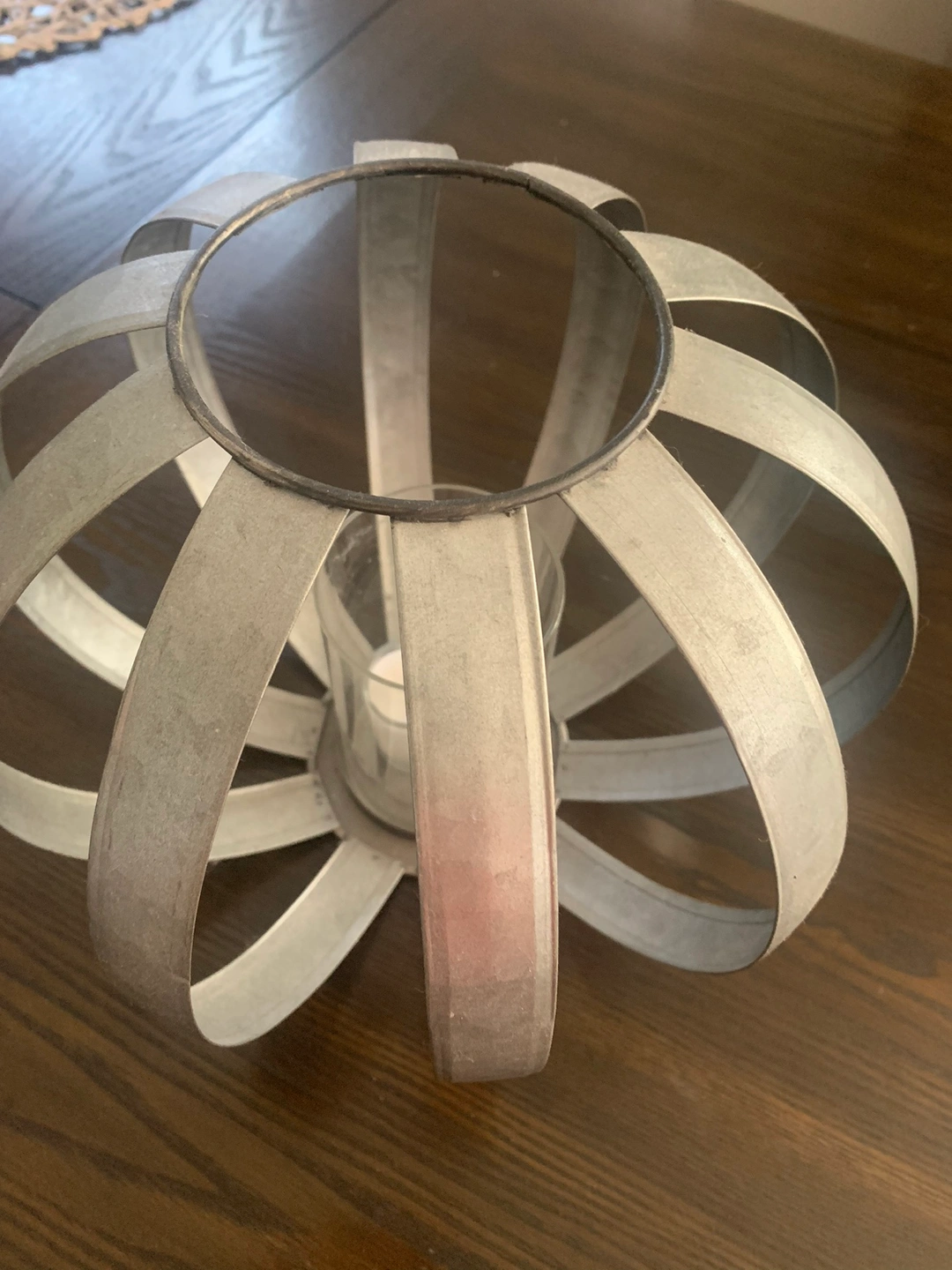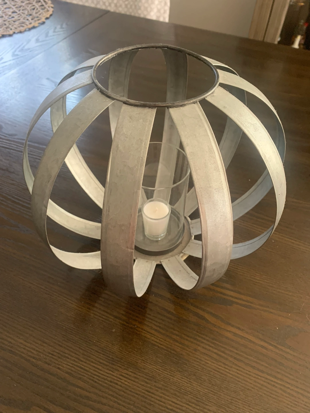 A round metal candle holder with a glass insert for a candle. The candle holder is a decorative piece for the home and is suitable for a pillar candle.