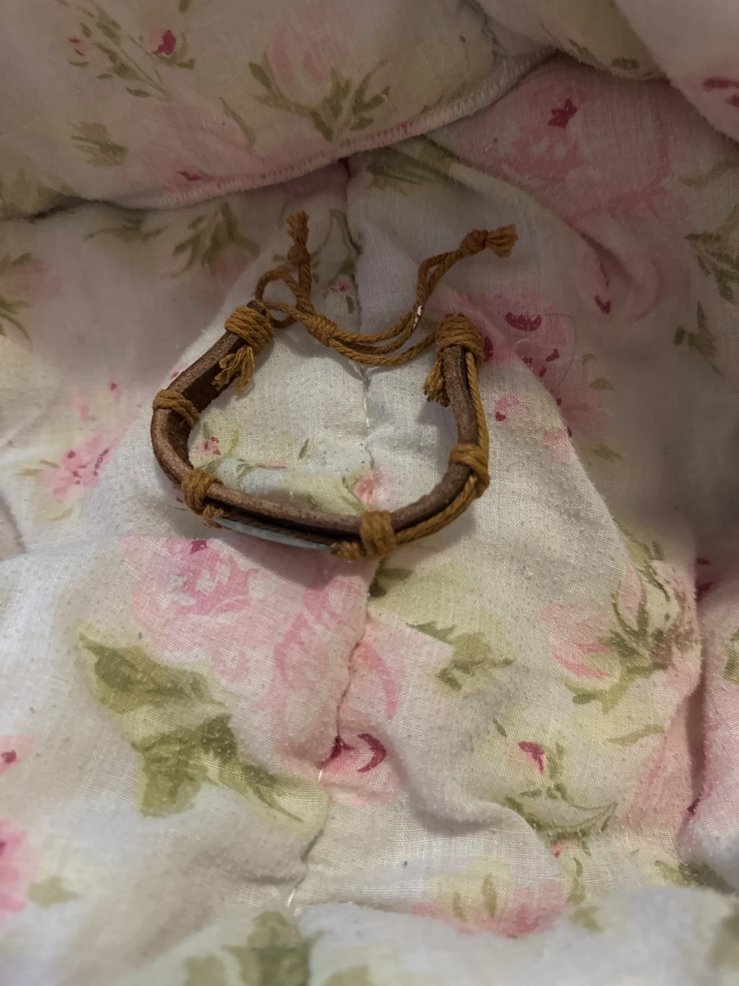 A handcrafted leather and string bracelet with a light blue accent. It's adjustable with tie closures. This accessory adds a casual touch to any outfit.
