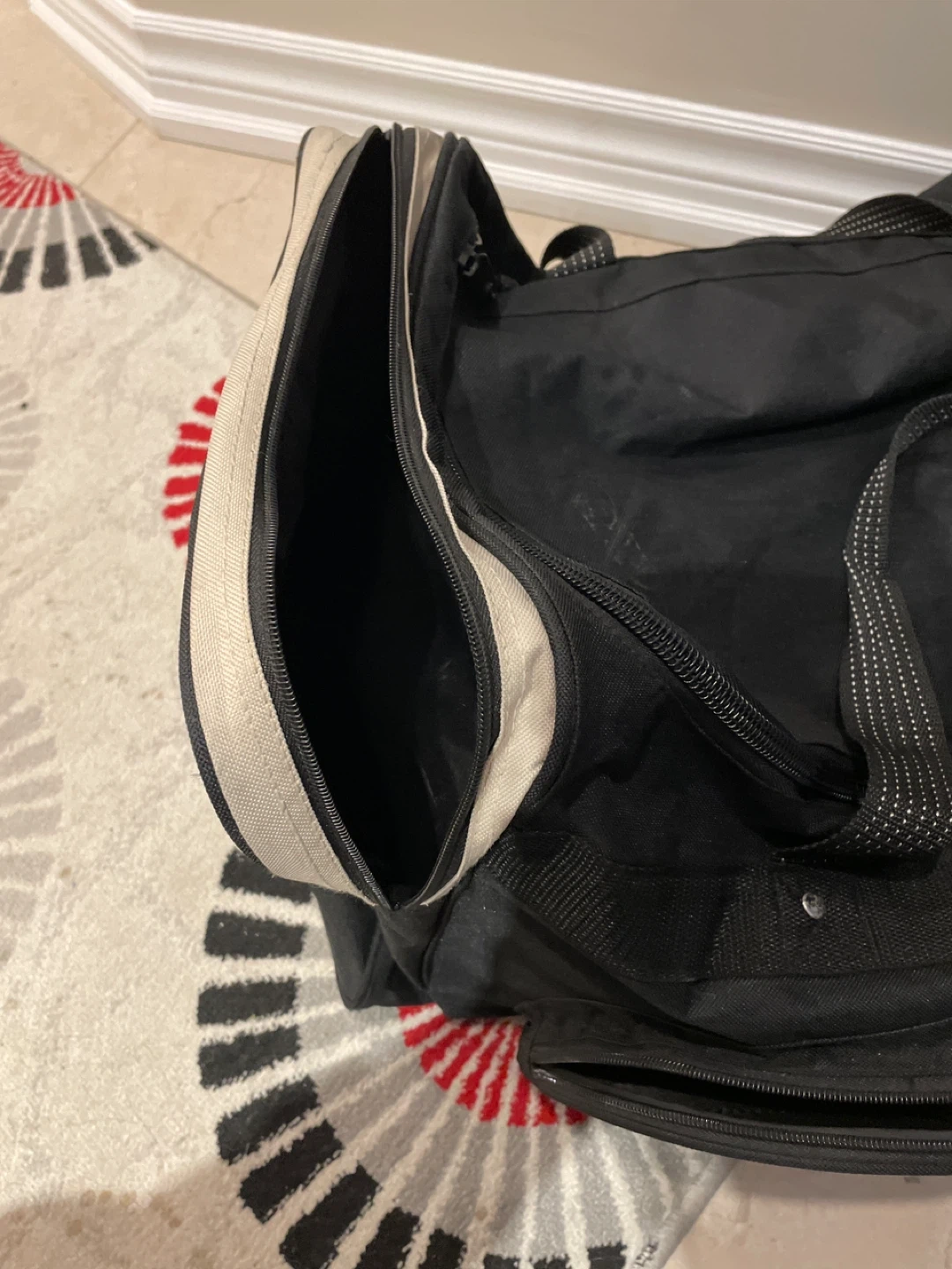 This is a black duffel bag featuring a Canada logo on the front. It has multiple zippered compartments for organization. Durable fabric construction.