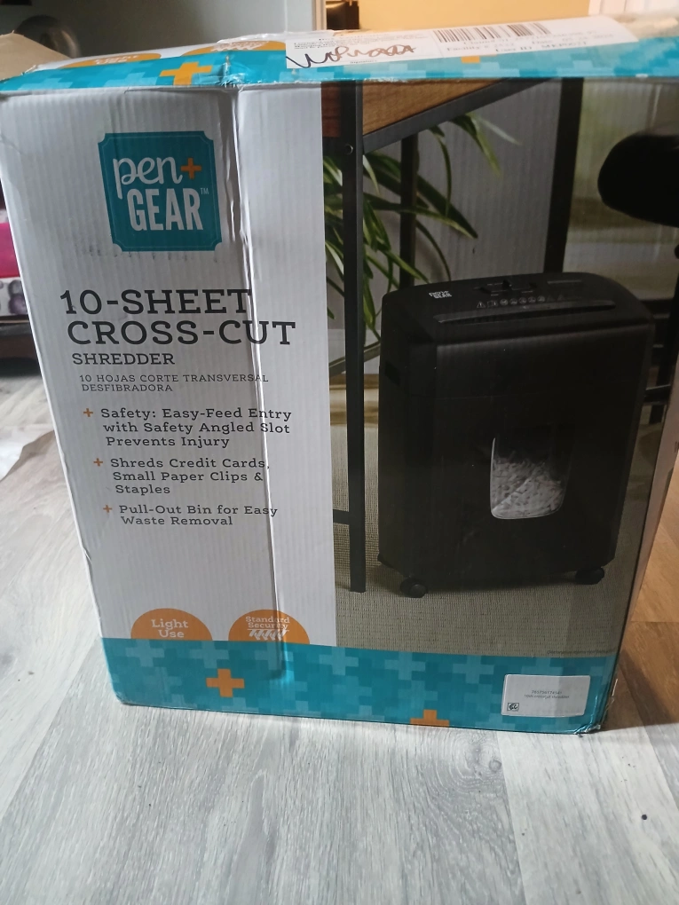 Brand new, still in box. 10-sheet capacity. Cross-cut shredding. Includes safety features. Shreds credit cards and paper clips. Easy waste removal.