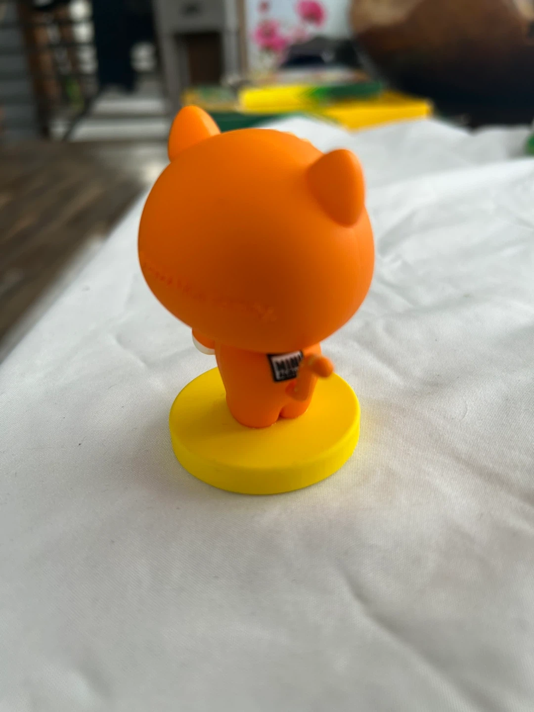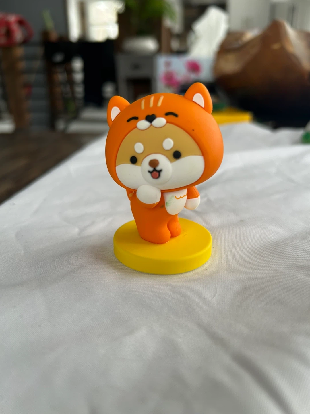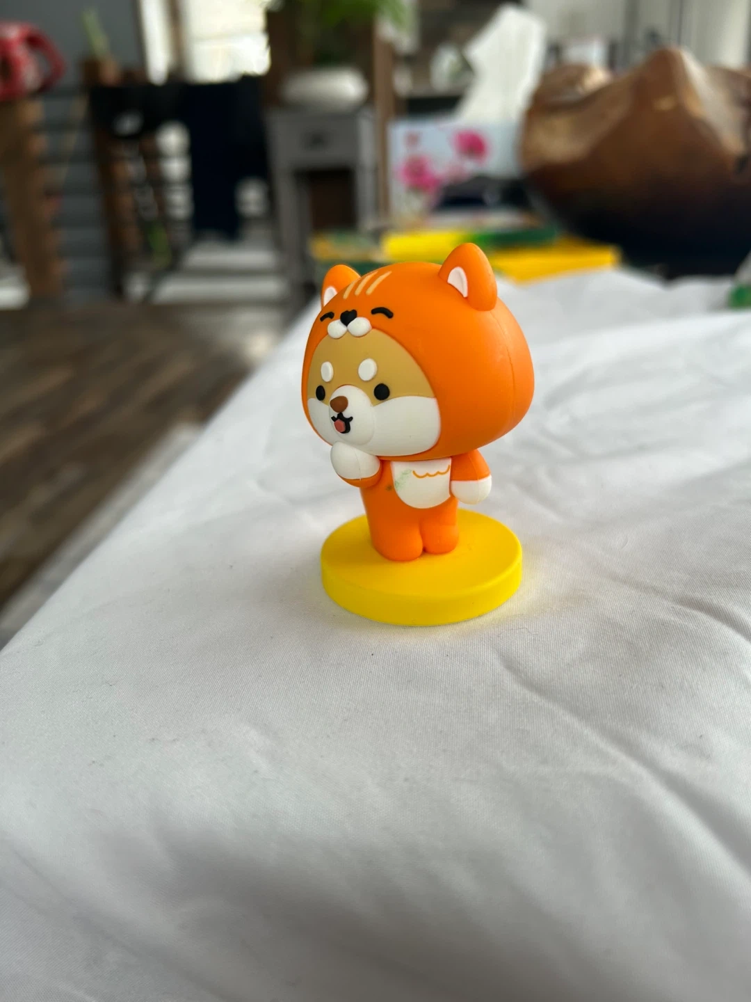 Cute orange Shiba Inu figurine with a hood, wearing a white shirt. It's standing on a yellow circular base. Great for desks or collectors!