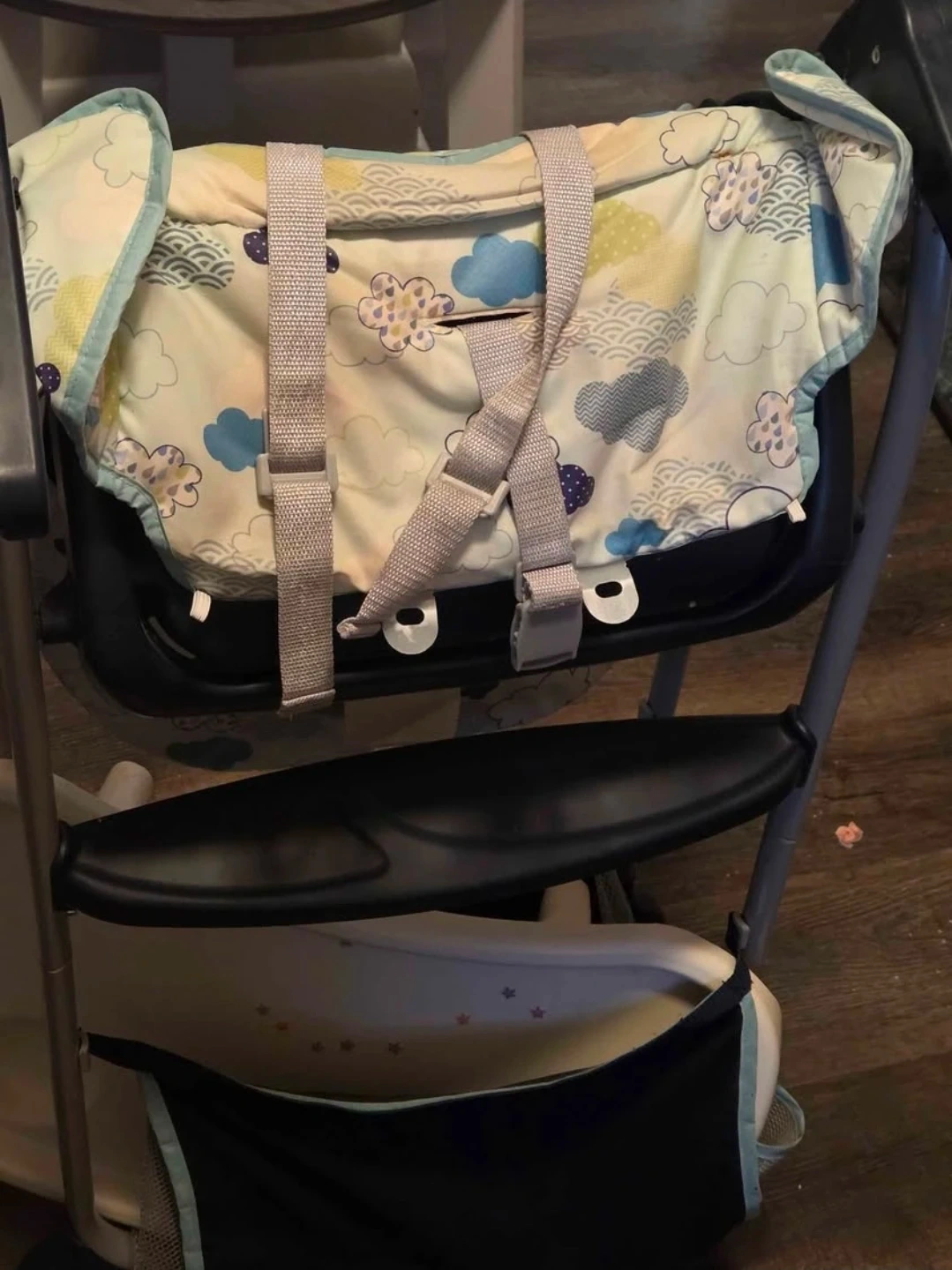 Selling a high chair that's in good condition! It features a cute cloud pattern cushion, perfect for your little one. The high chair also has a tray and a storage basket underneath. Made by graco!