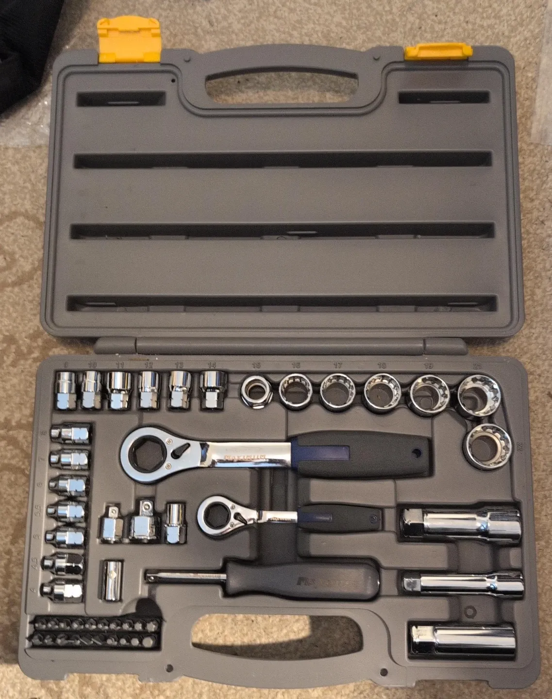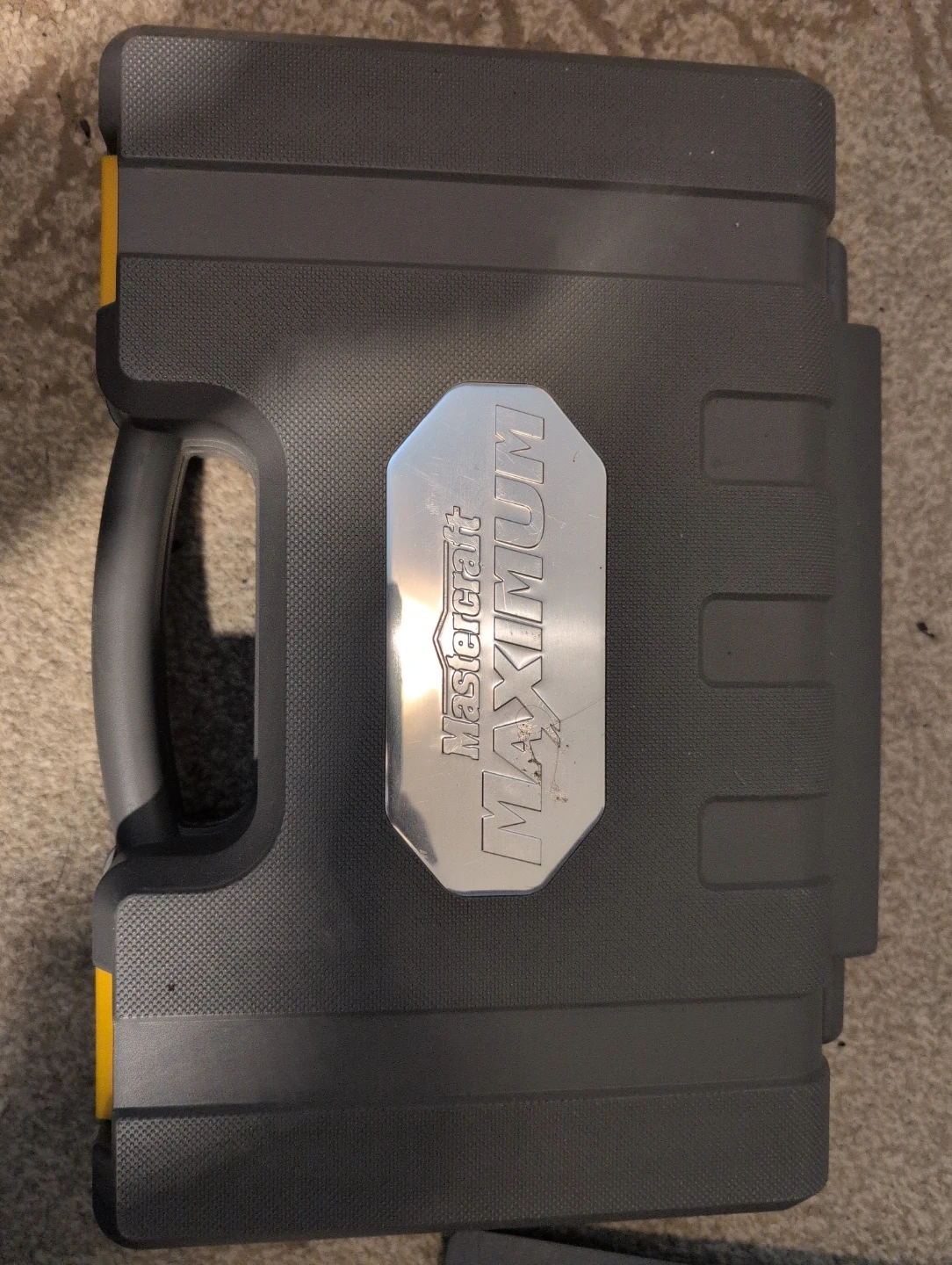 This is a Mastercraft Maximum socket set in a durable grey carrying case. It includes two ratchets, assorted sockets, and screwdriver bits. A great set for various home or automotive repairs!