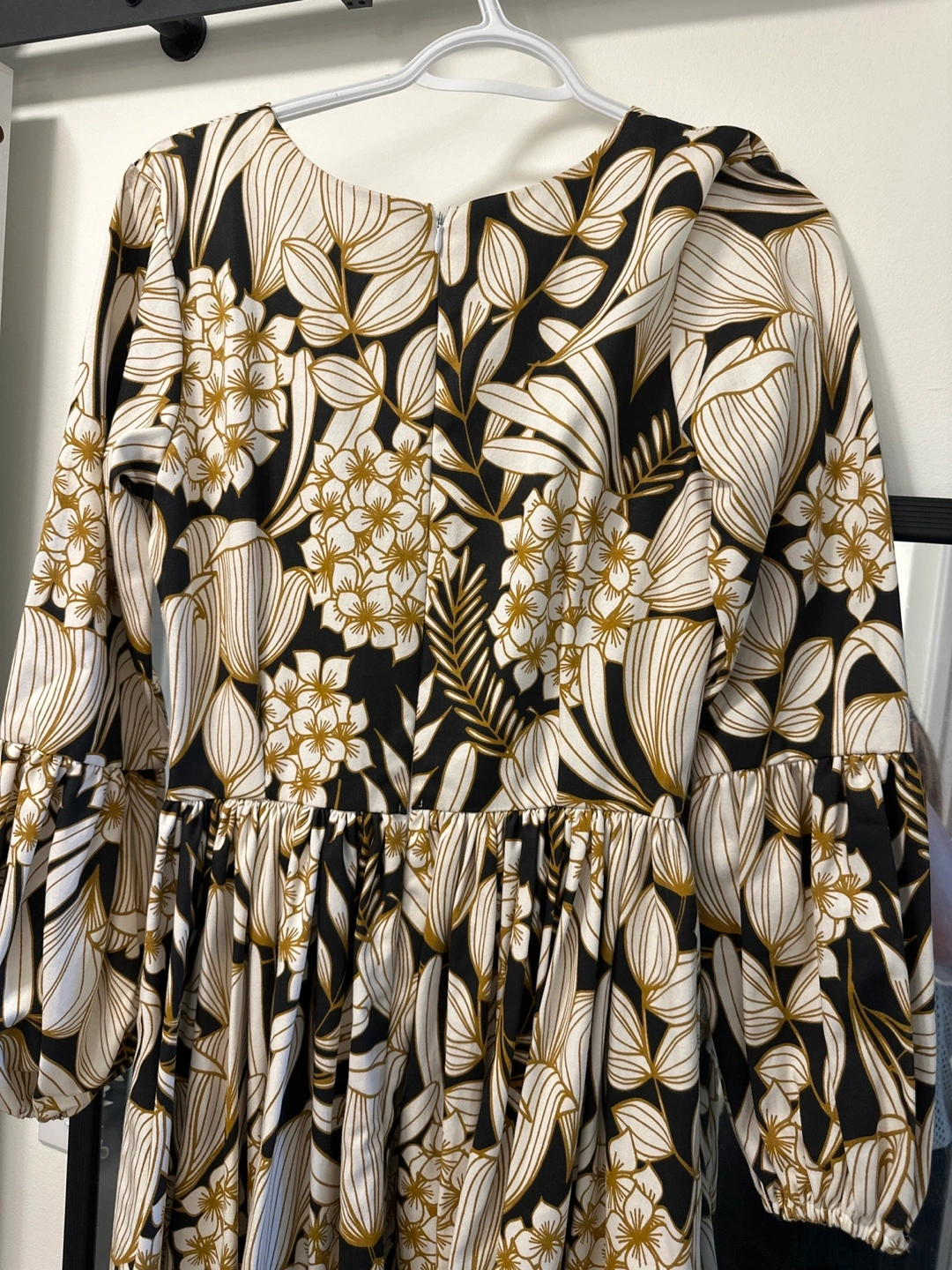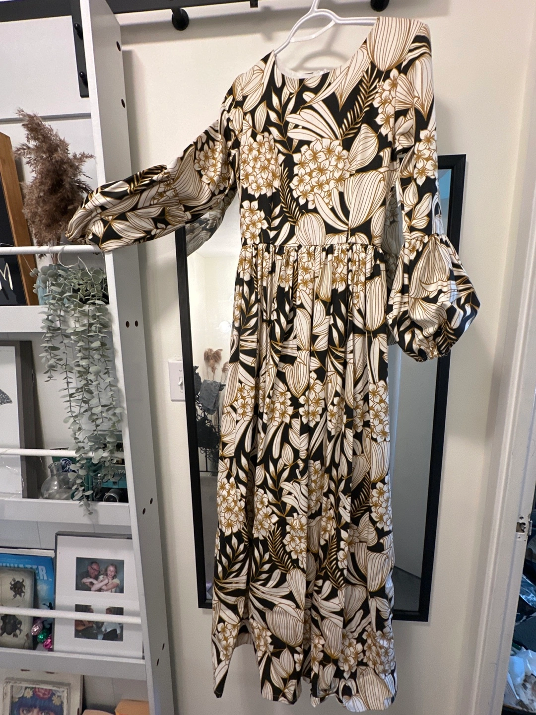 Gorgeous floor-length dress. Features a fitted bodice and a flowing skirt. Long puff sleeves and a round neckline. Black and gold floral print. Pocket detail.