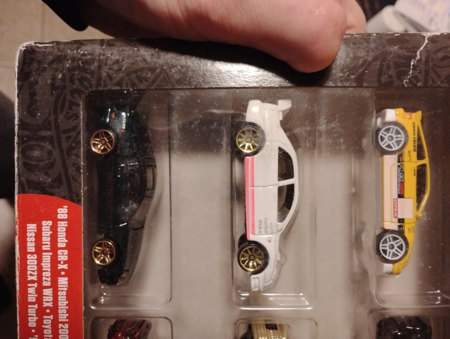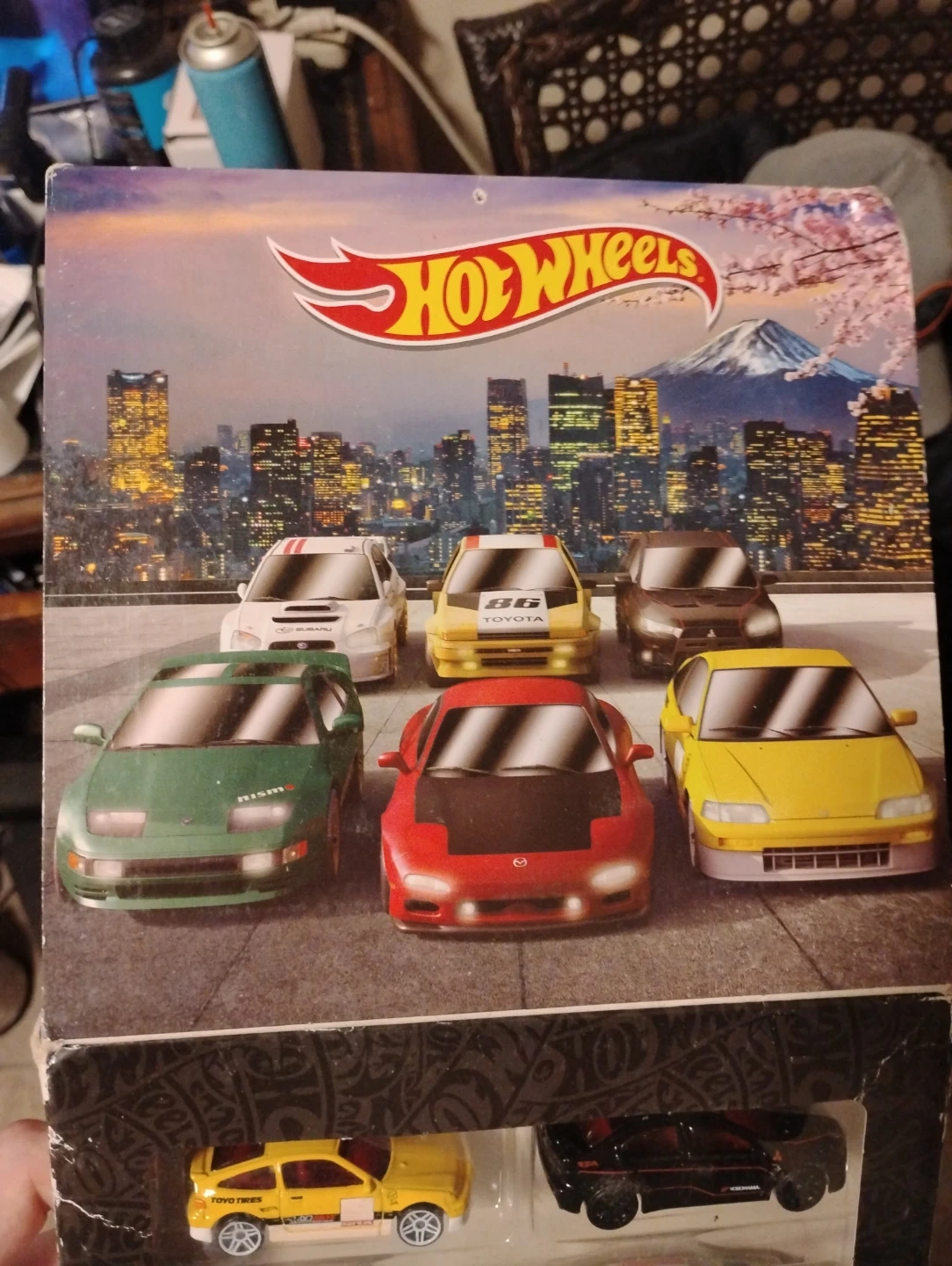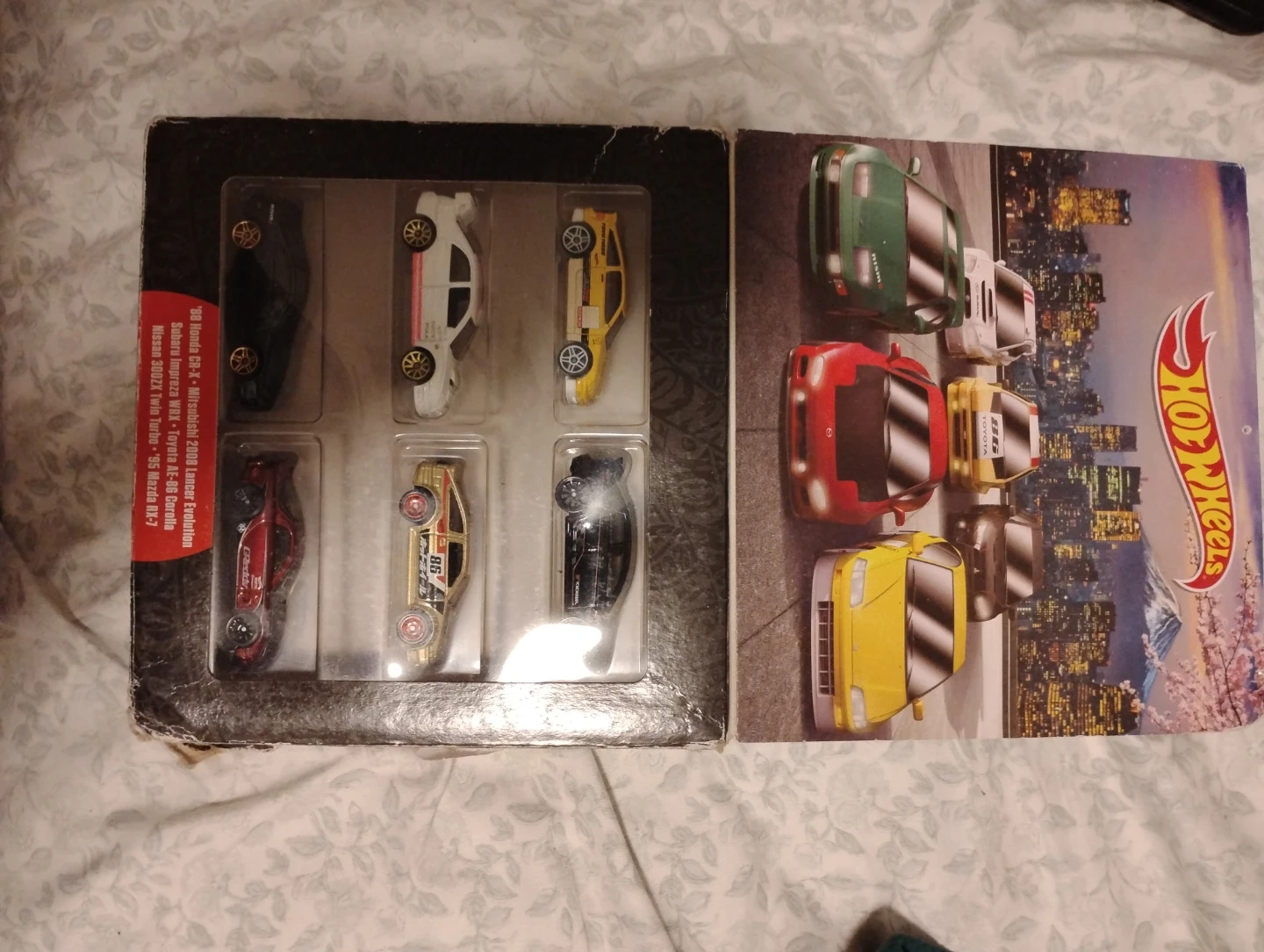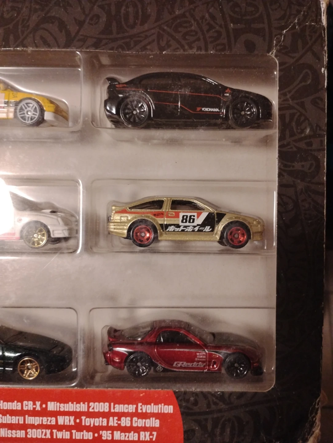 This Hot Wheels set includes six detailed die-cast cars. It features models like the '88 Honda CR-X, '95 Mazda RX-7, Mitsubishi Lancer Evolution, Nissan 300ZX Twin Turbo, Subaru Impreza WRX, and Toyota AE-86 Corolla. Perfect for collectors or playtime!