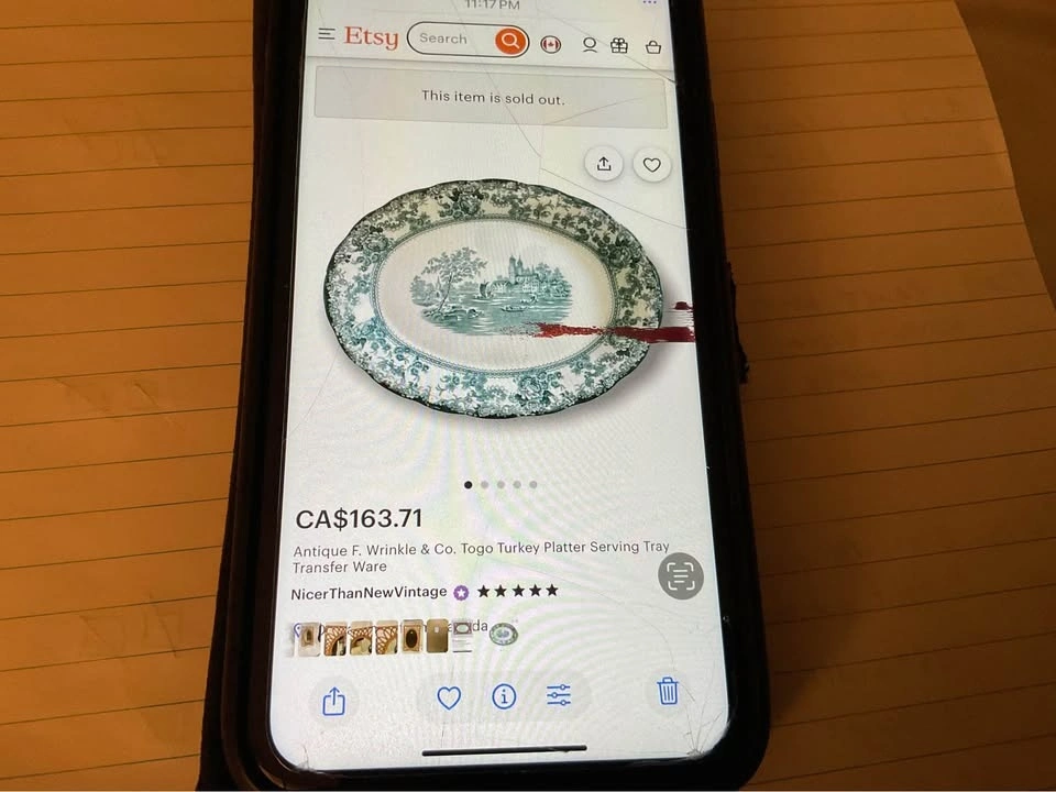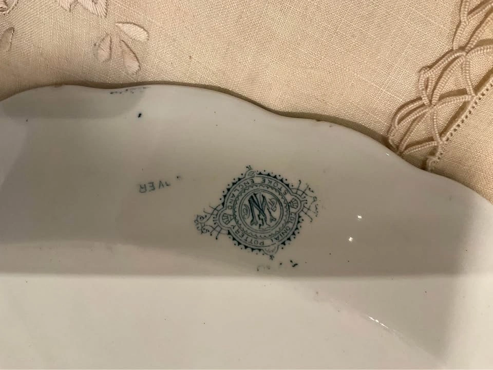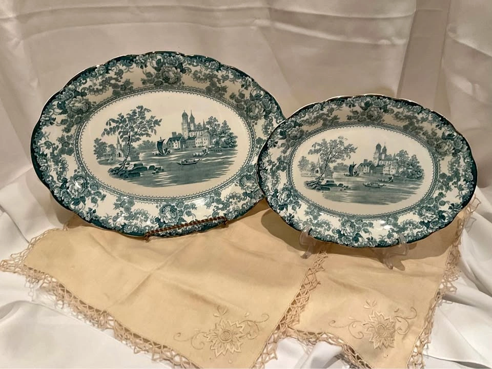 Stunning pair of vintage transferware serving platters in the lovely teal "Togo" pattern. Collectible Staffordshire Pottery pieces. One large platter measures 16 x 11 1/2 inches, and the smaller one measures 12 x 9 inches. From a smoke and pet-free home. Available for cash purchase in Richmond Hill, near Bathurst & King Rd.