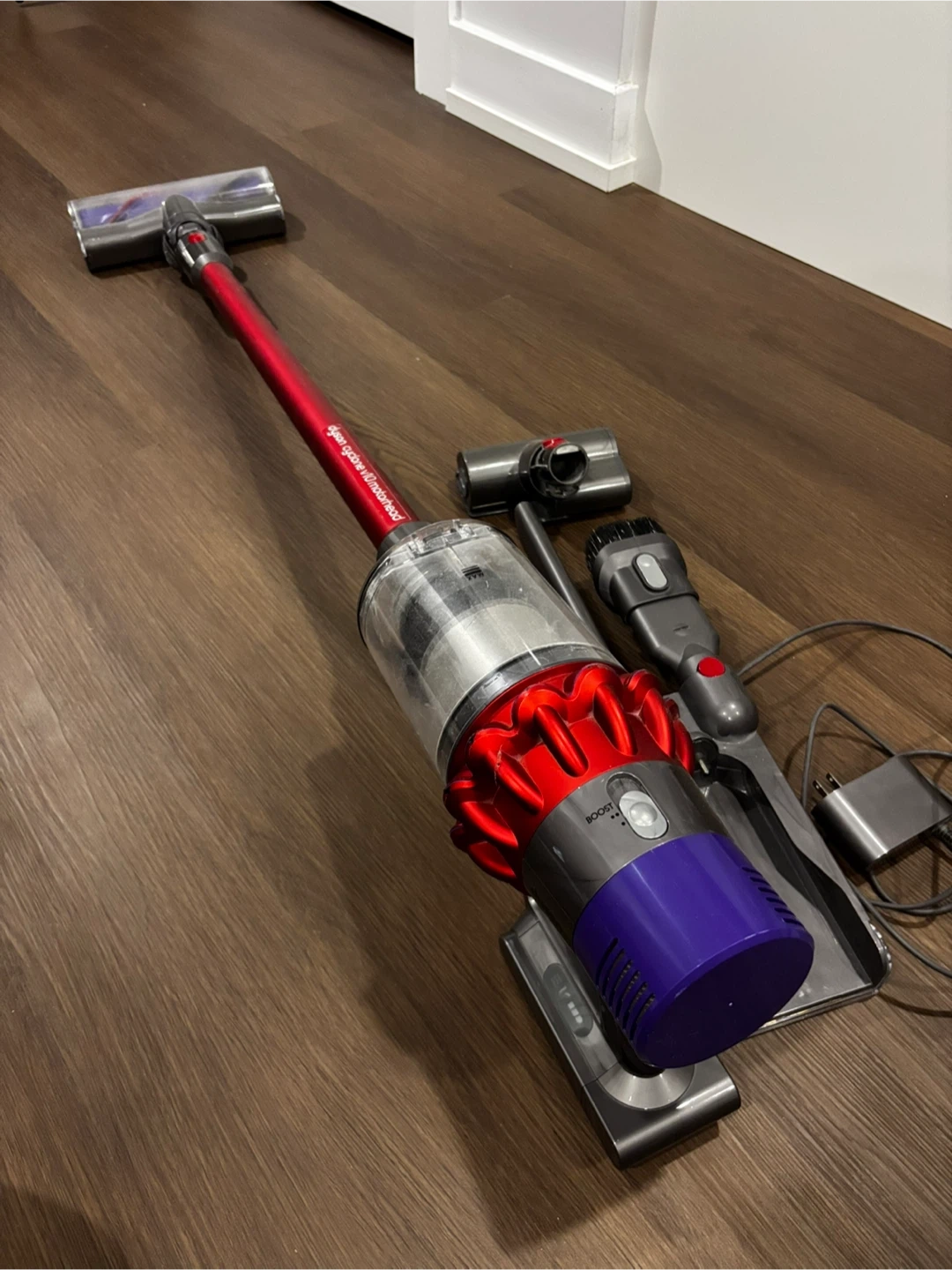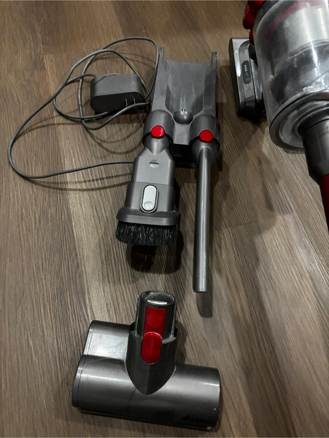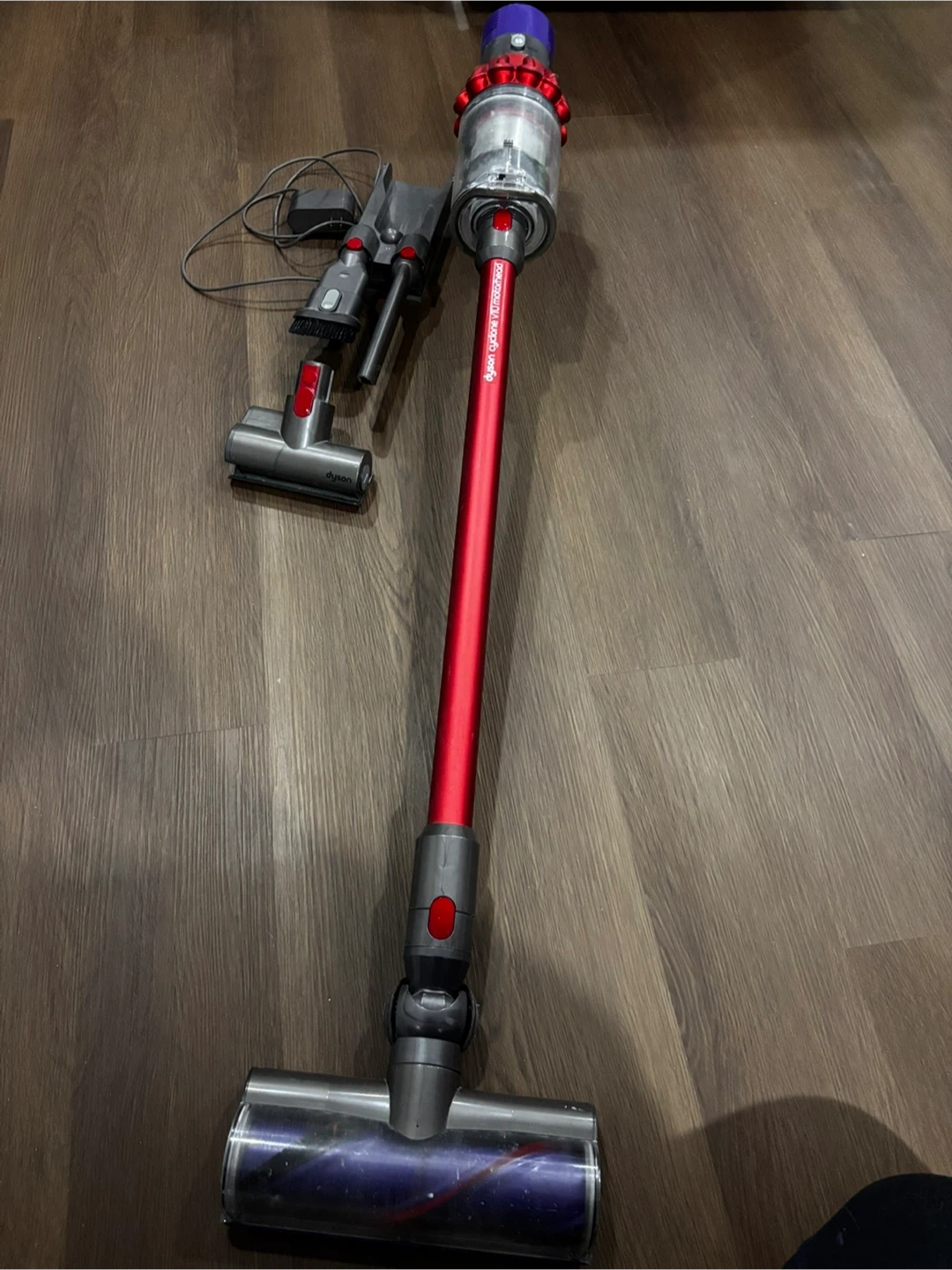 This is a red Dyson Cyclone V10 Motorhead vacuum cleaner. It comes with a charger and multiple attachments. Powerful suction for effective cleaning! Works great with no issues.