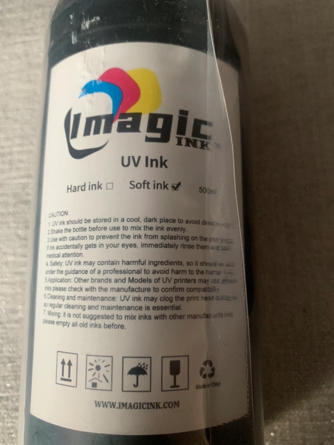Imaginc brand UV ink in soft formulation. It's a 500ml bottle. Always store in a cool, dark place and shake before use.