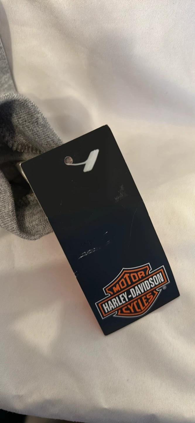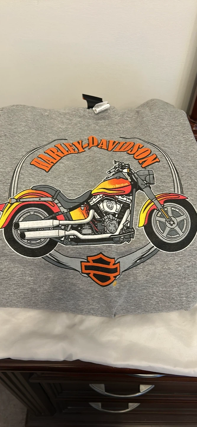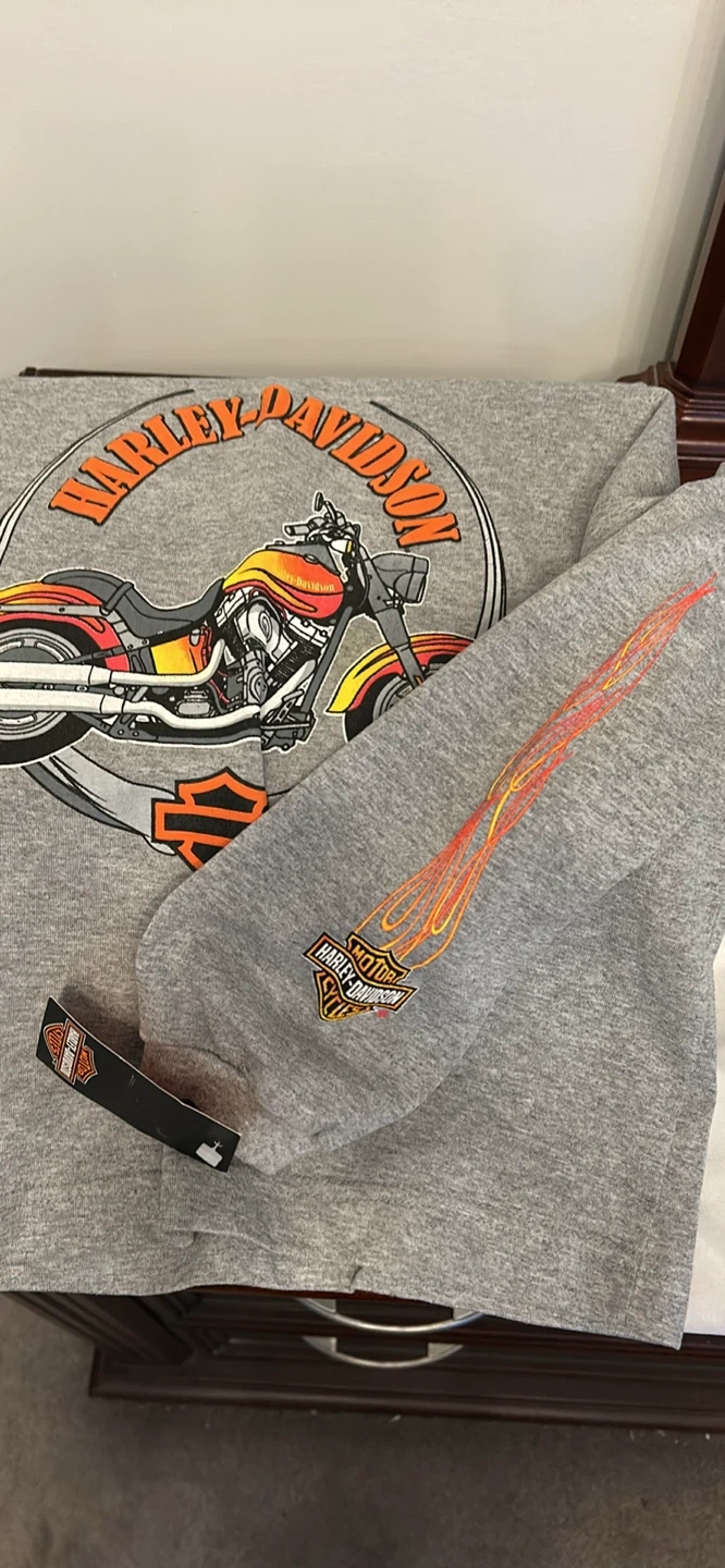 This grey long sleeve shirt features a Harley-Davidson motorcycle graphic on the front and sleeve. It's made of 95% cotton and 5% polyester. The size is Youth Medium, fitting a 10/12.