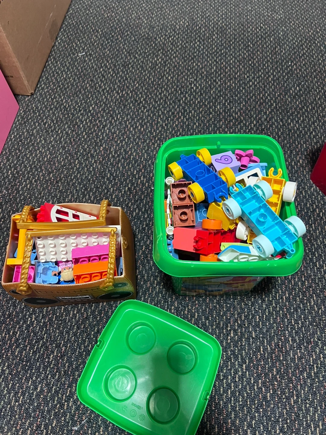 Includes a LEGO Duplo bucket filled with blocks and a gold boombox-shaped toy box also containing blocks. Both are great for little builders!