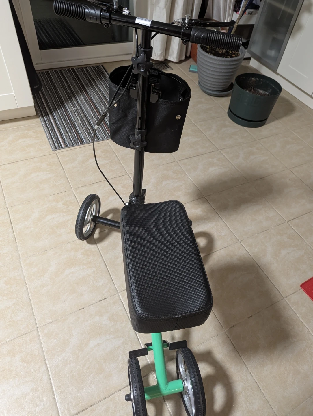 This is an ElengerG knee scooter in green. It comes with a black storage basket attached to the handle. It's designed for mobility assistance. Great for temporary leg injuries!