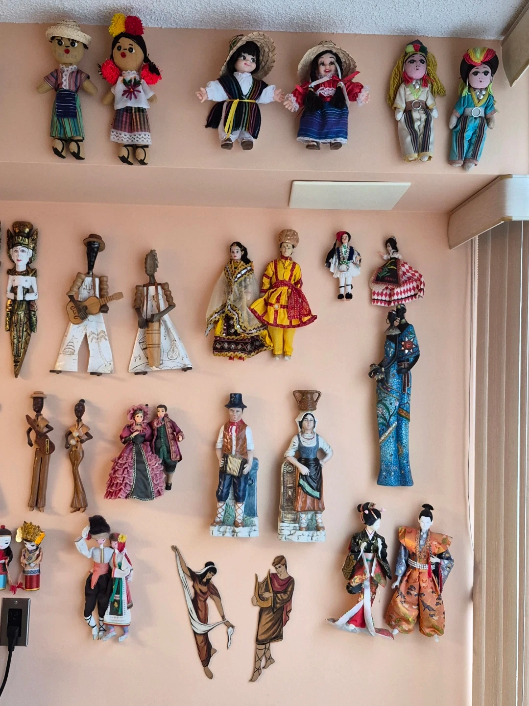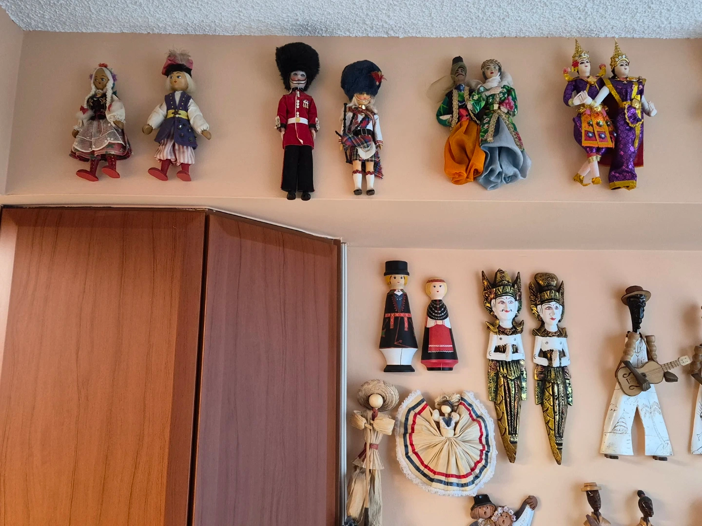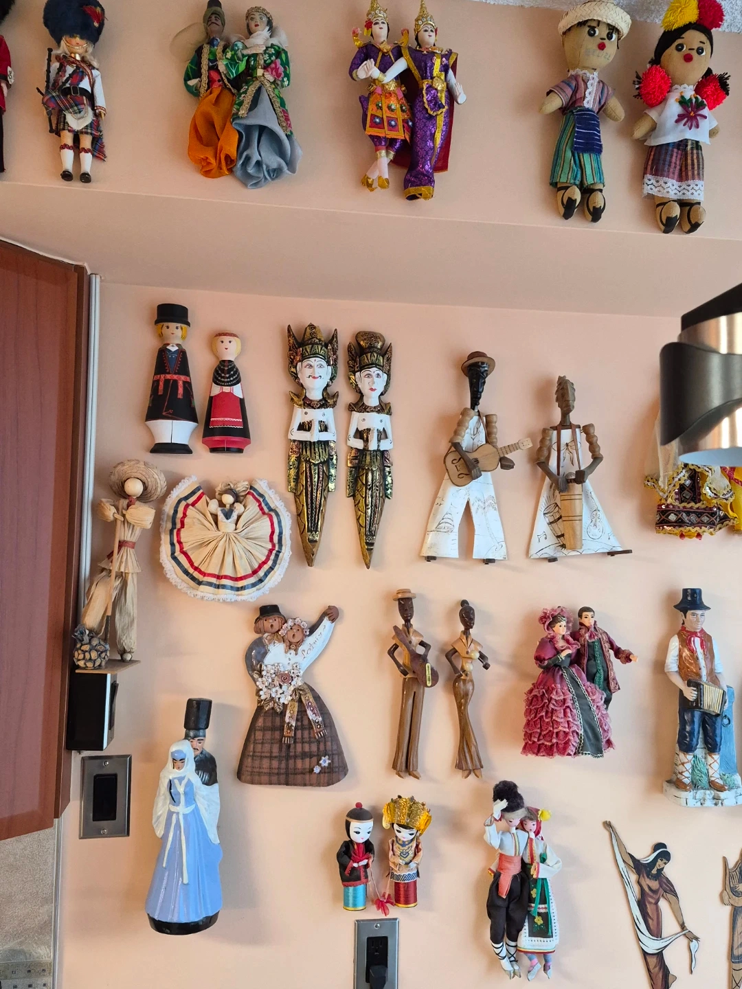 A collection of dolls from different countries. All are pairs.