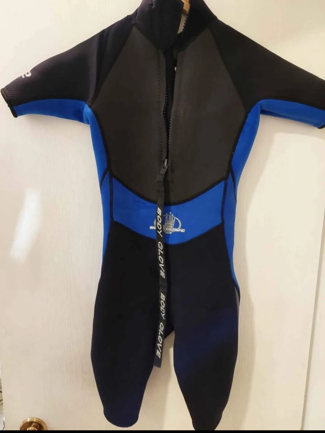 Blue and black short-sleeve wetsuit by Body Glove. It's made from neoprene material for warmth. Front zipper closure for easy wear. Great for water sports!
