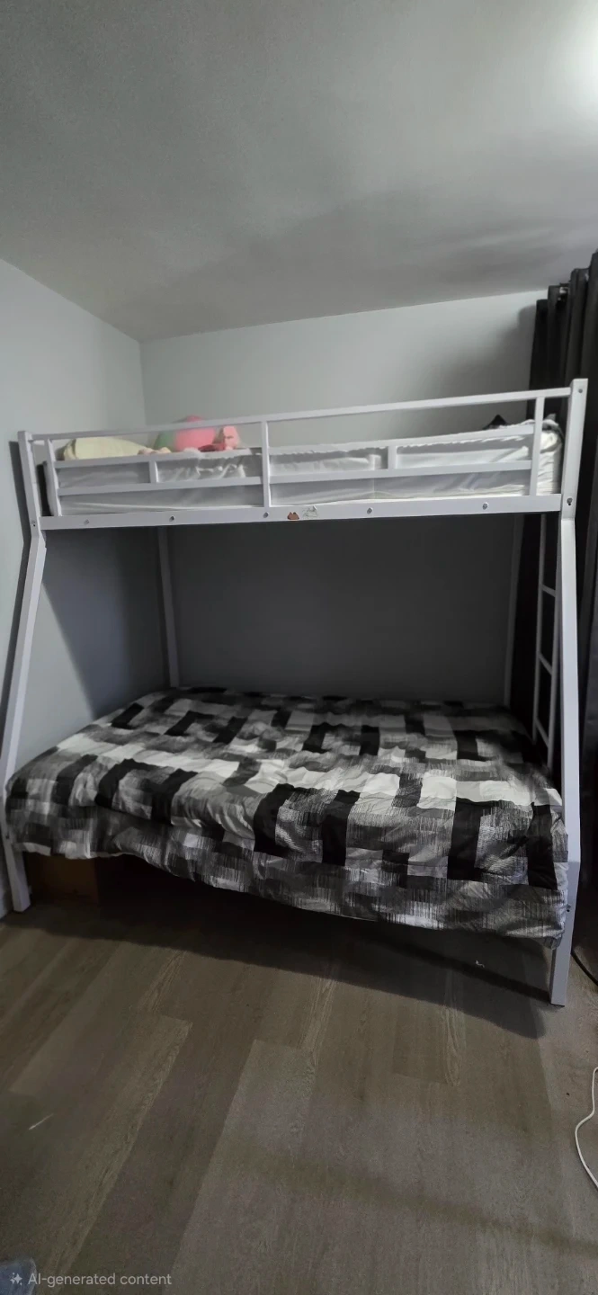 This white metal bunk bed is perfect for saving space. It has a sturdy metal frame and includes a ladder for easy access to the top bunk. The bottom bunk is a double size, and the top bunk is a single size. The beds have guardrails for safety. Mattress not included