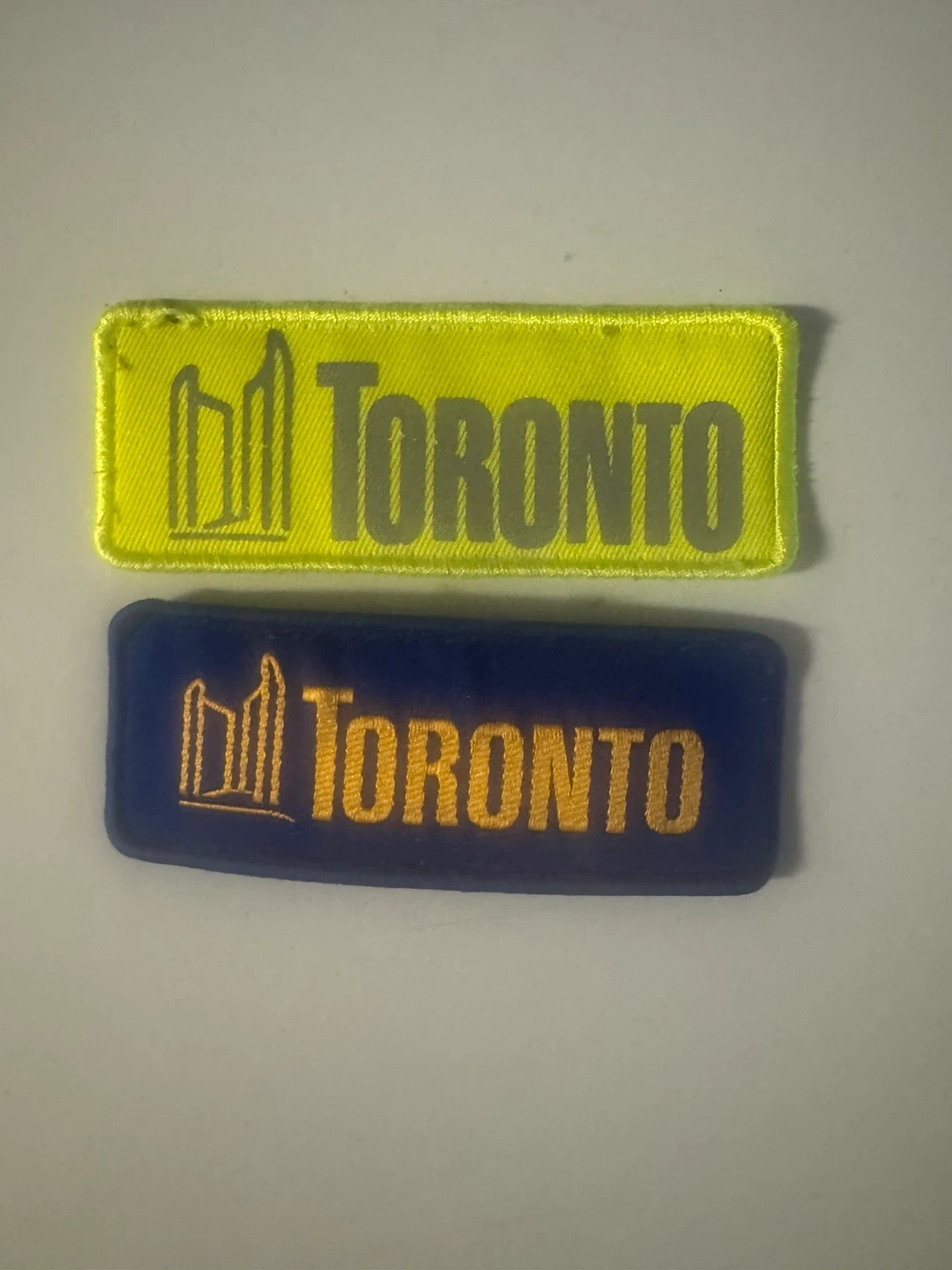 These are two City of Toronto patches, one in hi-vis neon yellow and one in navy blue. They both feature the City of Toronto logo. Great for customizing jackets or bags!