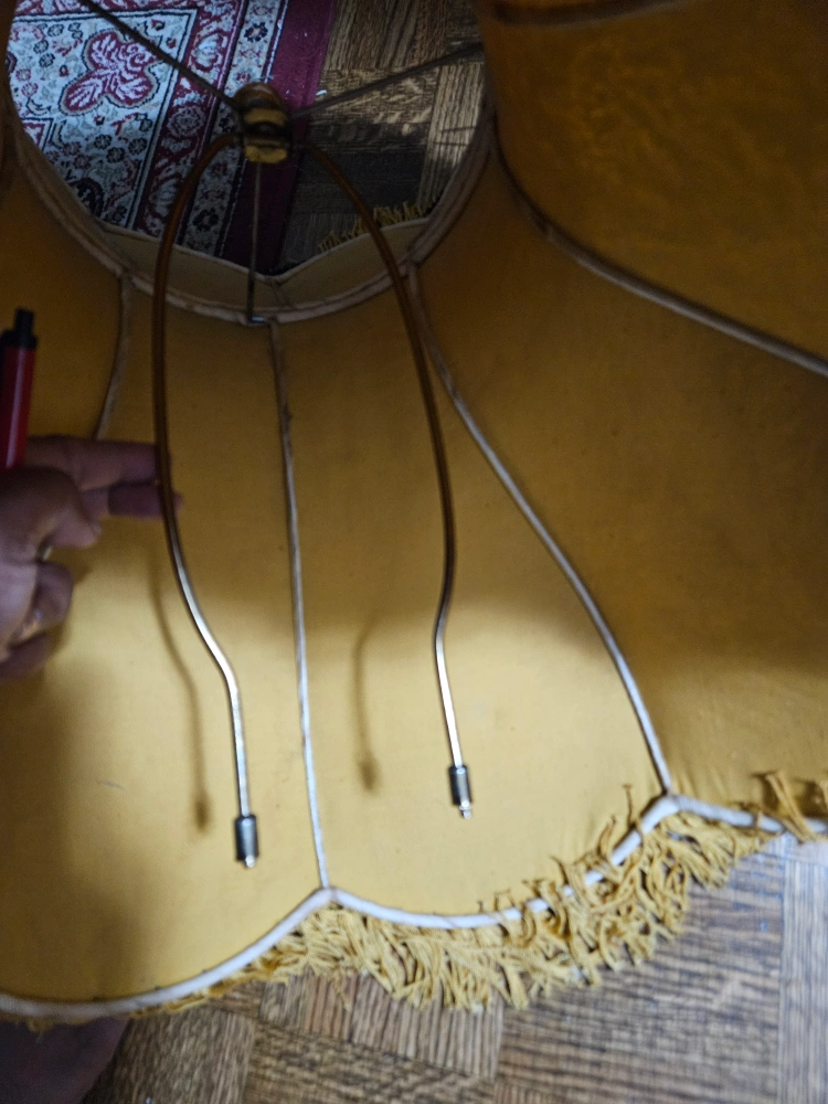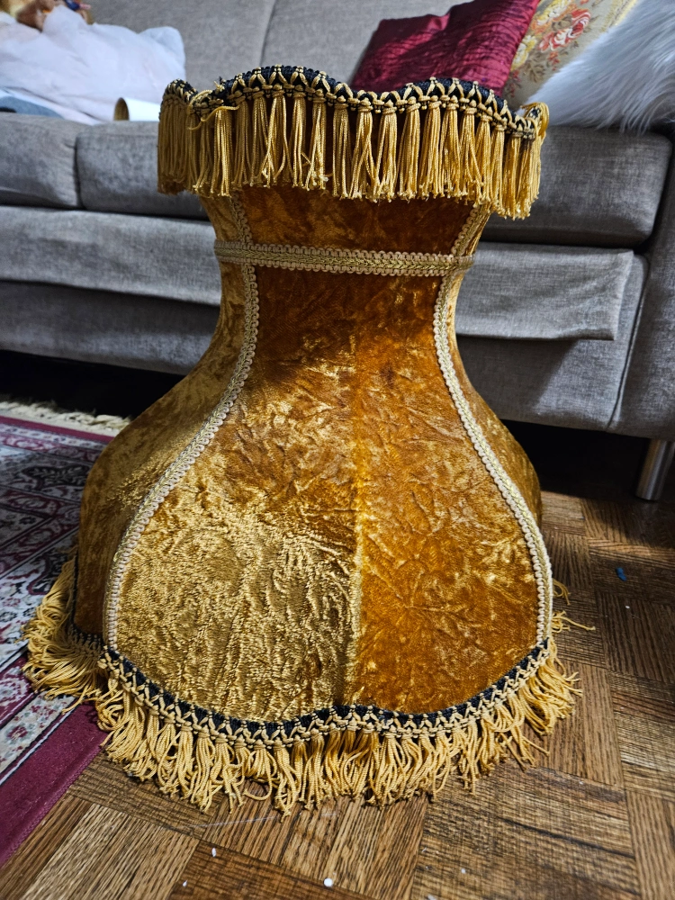 Large gold velvet lampshade with trim. It is in good condition. The lampshade measures approximately 20 inches across the bottom and 15 inches tall. It has a standard harp fitting and has been cleaned. The lampshade will need to be picked up in person near bloor/ossington.