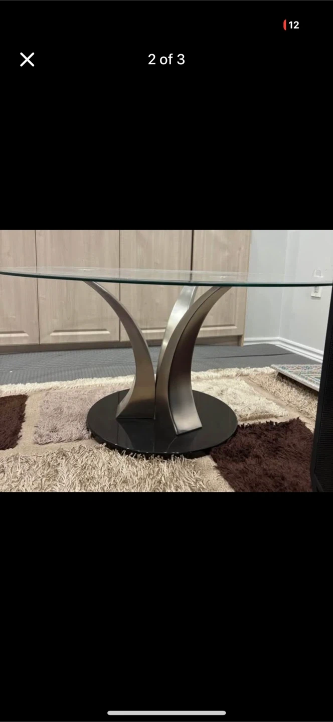 This is a modern glass top coffee table with a sturdy base. It's made with a clear glass top and a dark, possibly wood or laminate, pedestal base. The base has a curved metal accent. It's a nice focal point for a living room.