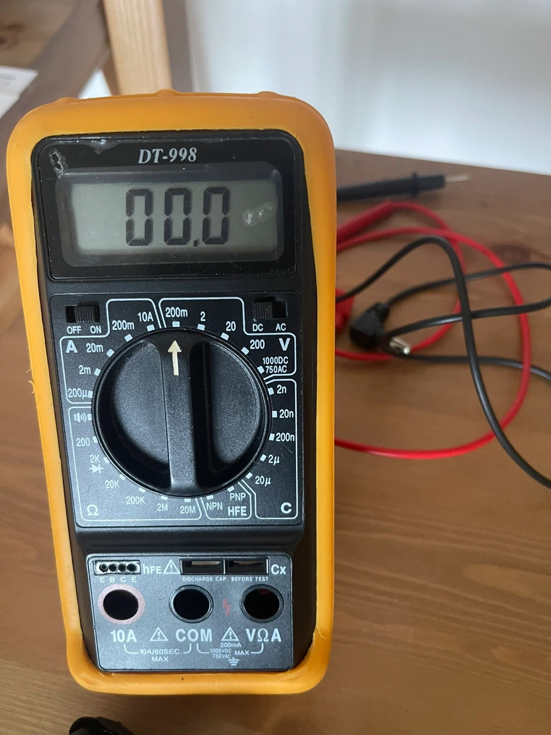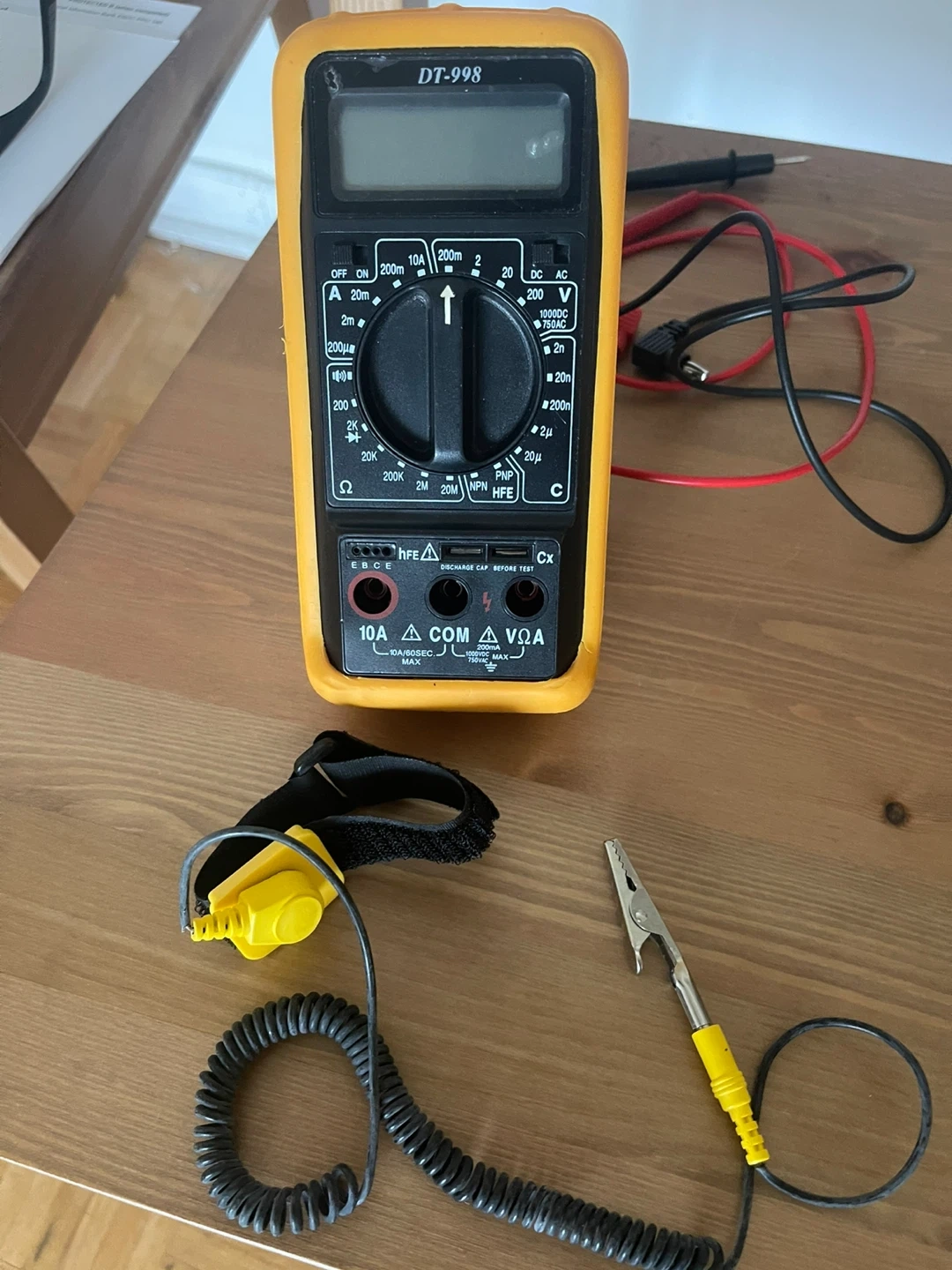 This is a DT-998 digital multimeter. It measures AC/DC voltage, current, and resistance. Includes test leads and an anti-static wrist strap. NEW thanks