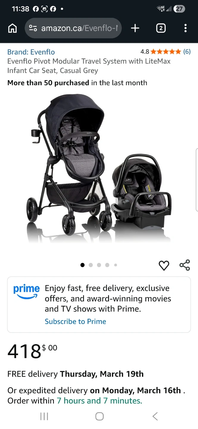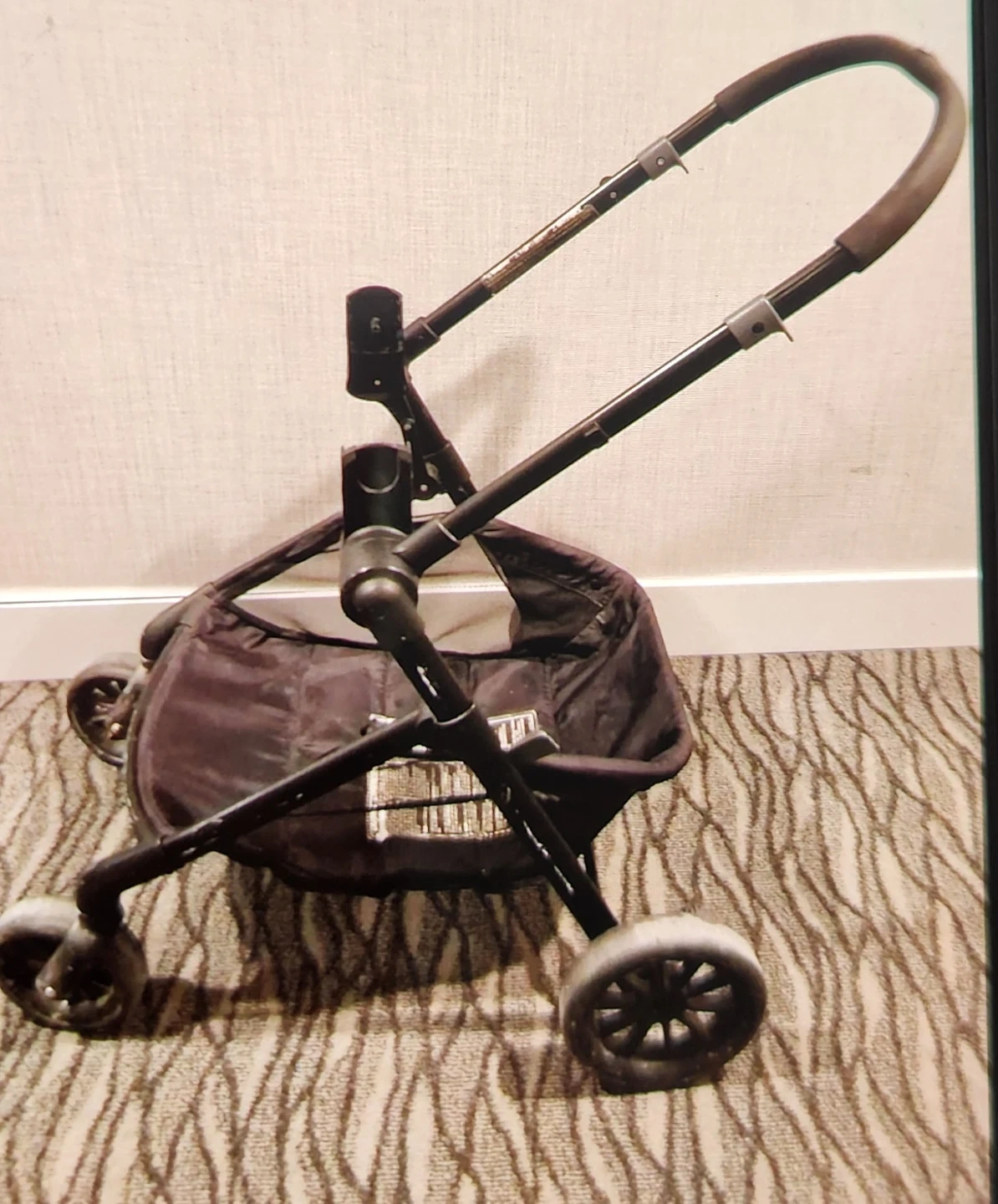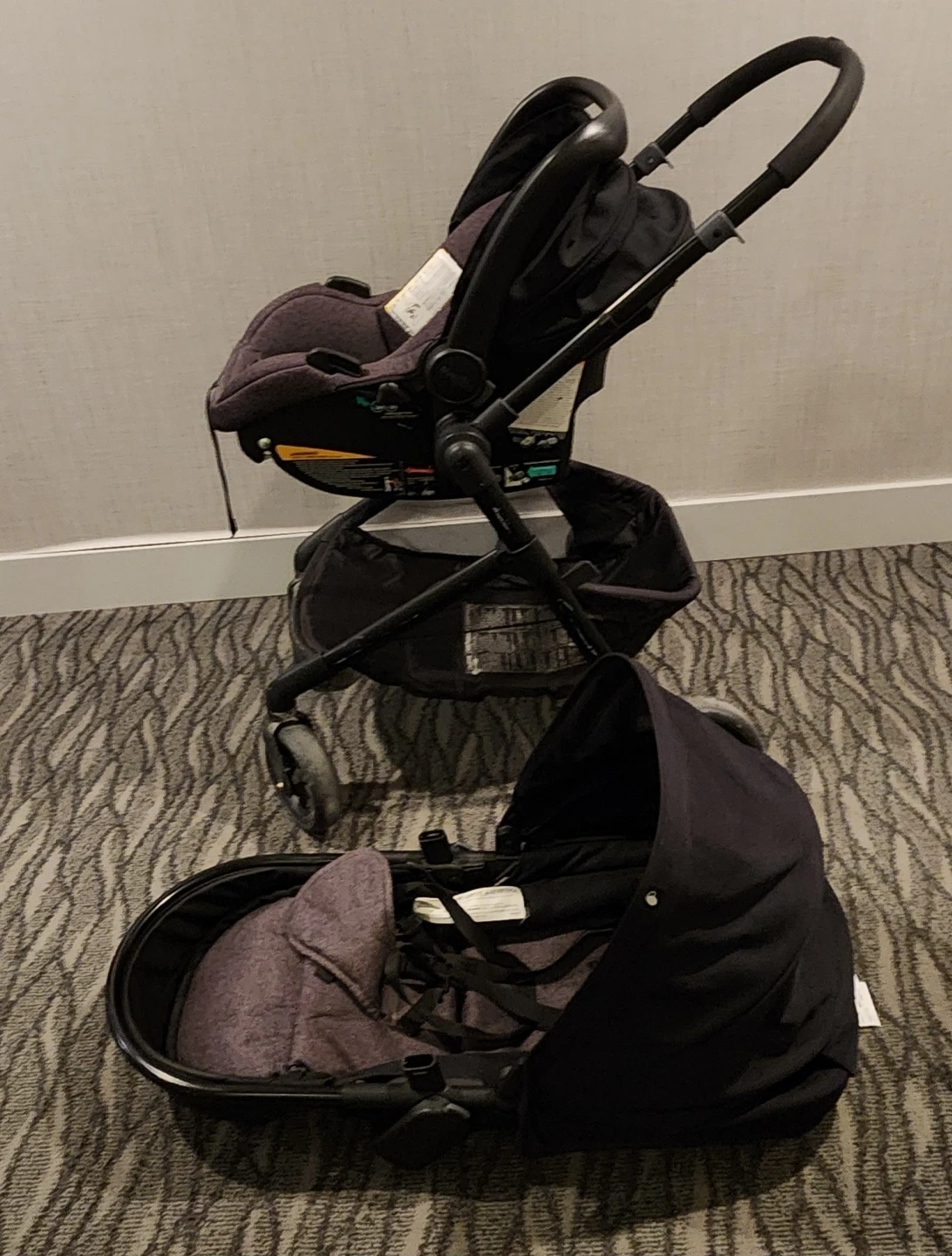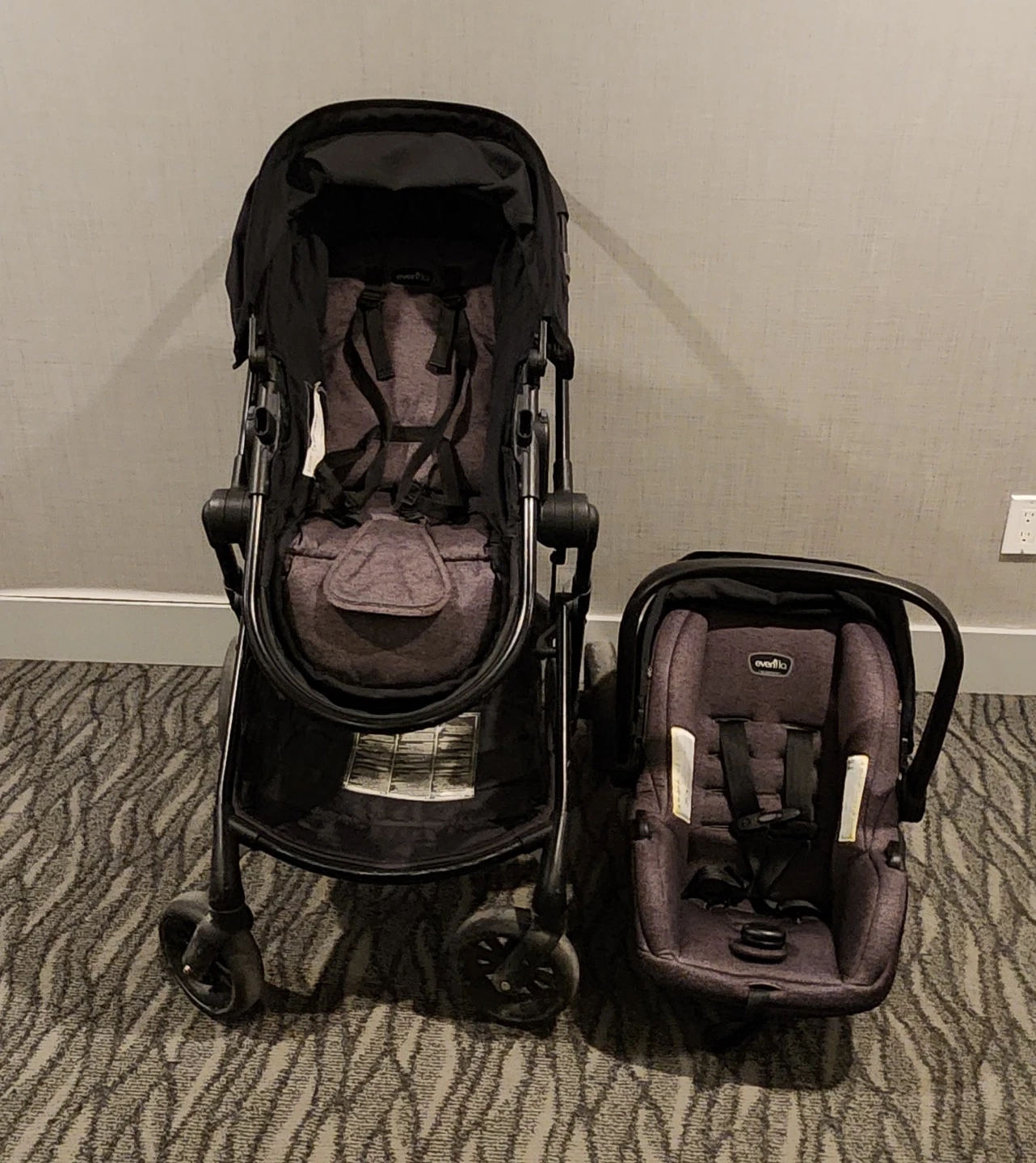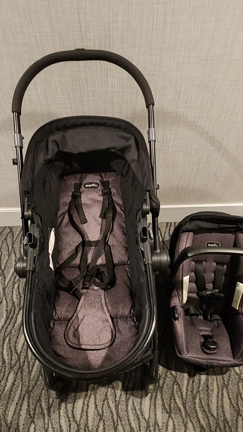 Black Evenflo stroller travel system. It includes a stroller and a car seat. Perfect for on-the-go parents!