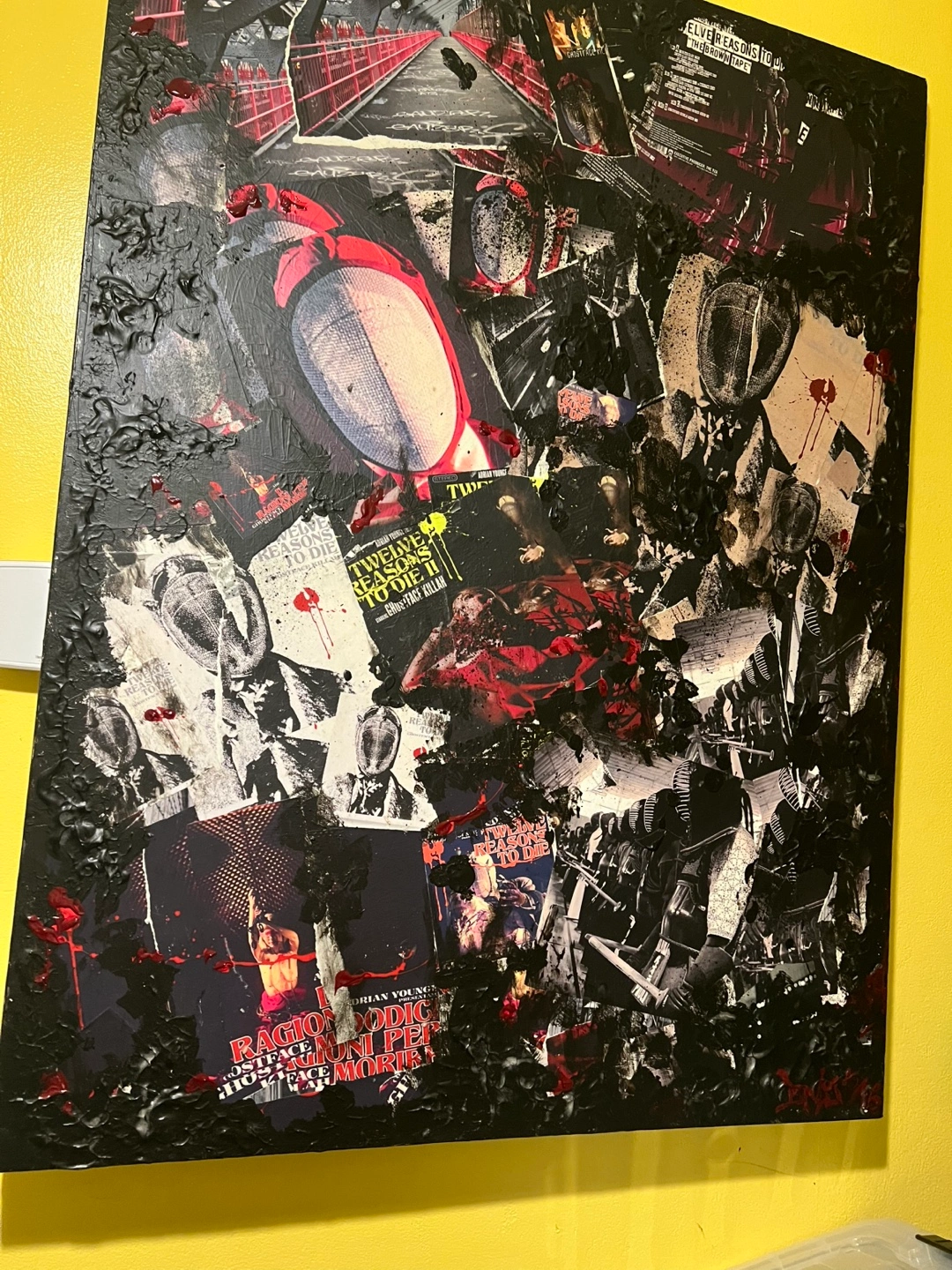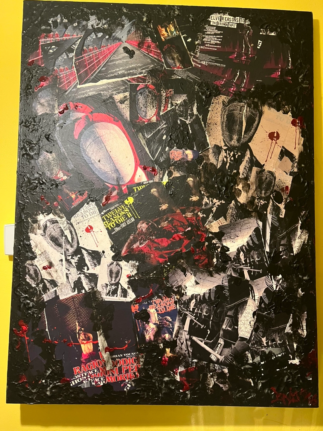 Unique mixed media collage artwork. Features a dark, abstract design with elements of print and texture. It's a striking piece for any collection..