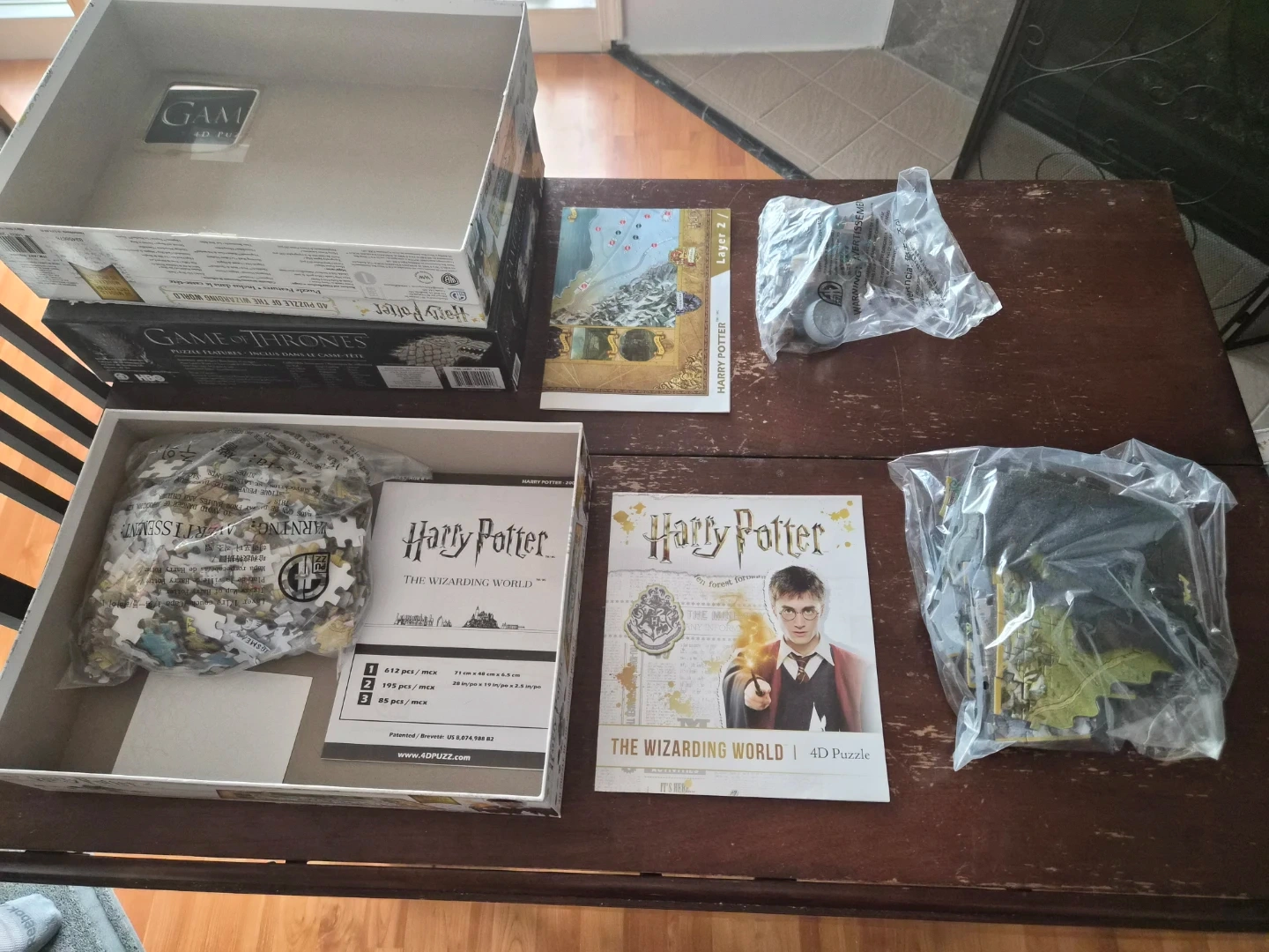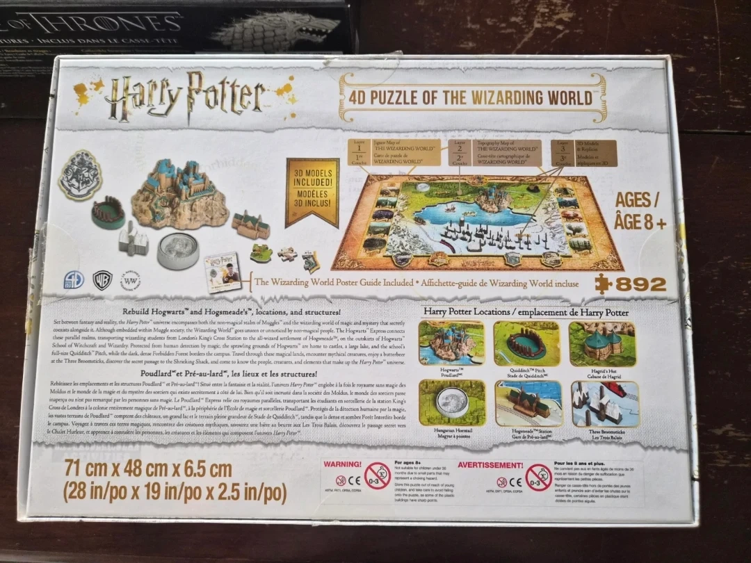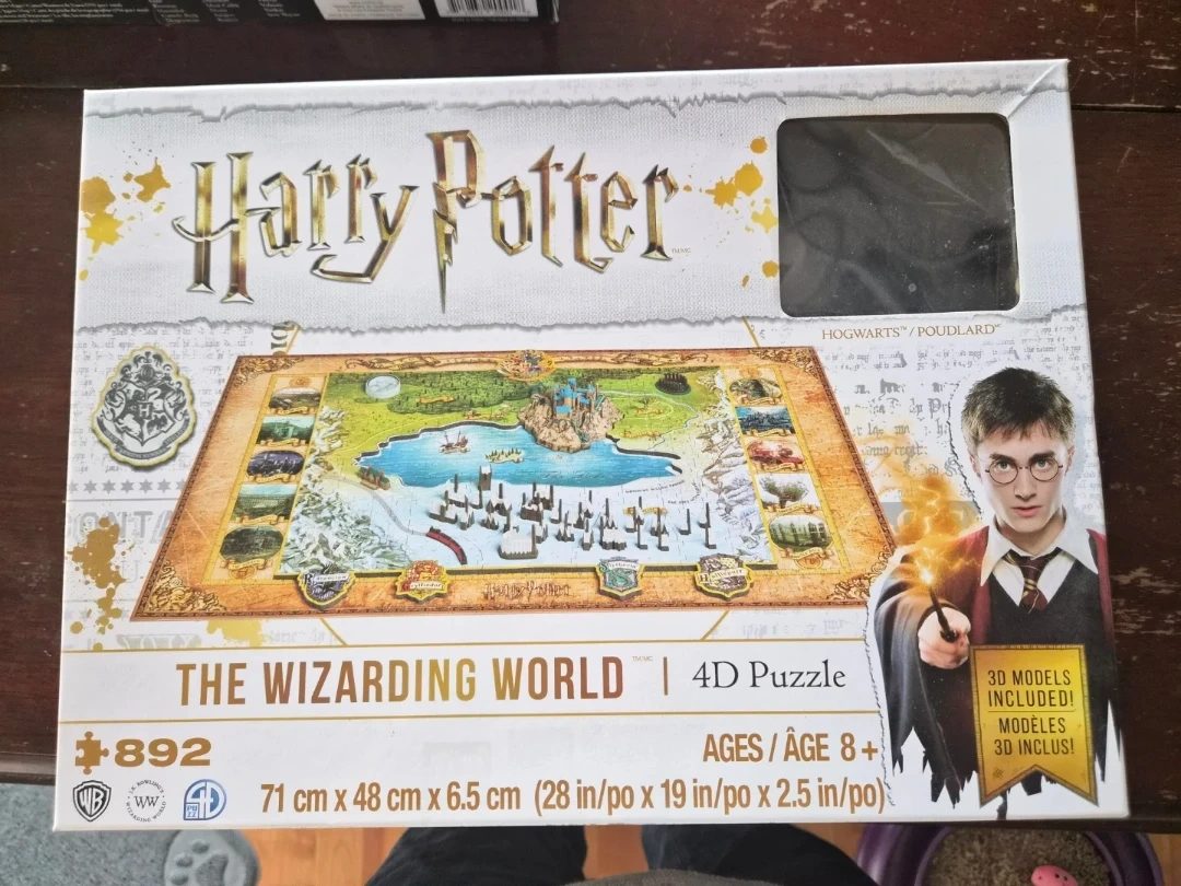 Selling a Harry Potter The Wizarding World 4D Puzzle! It includes 3D models and the Wizarding World guide. The puzzle is recommended for ages 8+. The box dimensions are 71 cm x 48 cm x 6.5 cm (28 in/po x 19 in/po x 2.5 in/po).