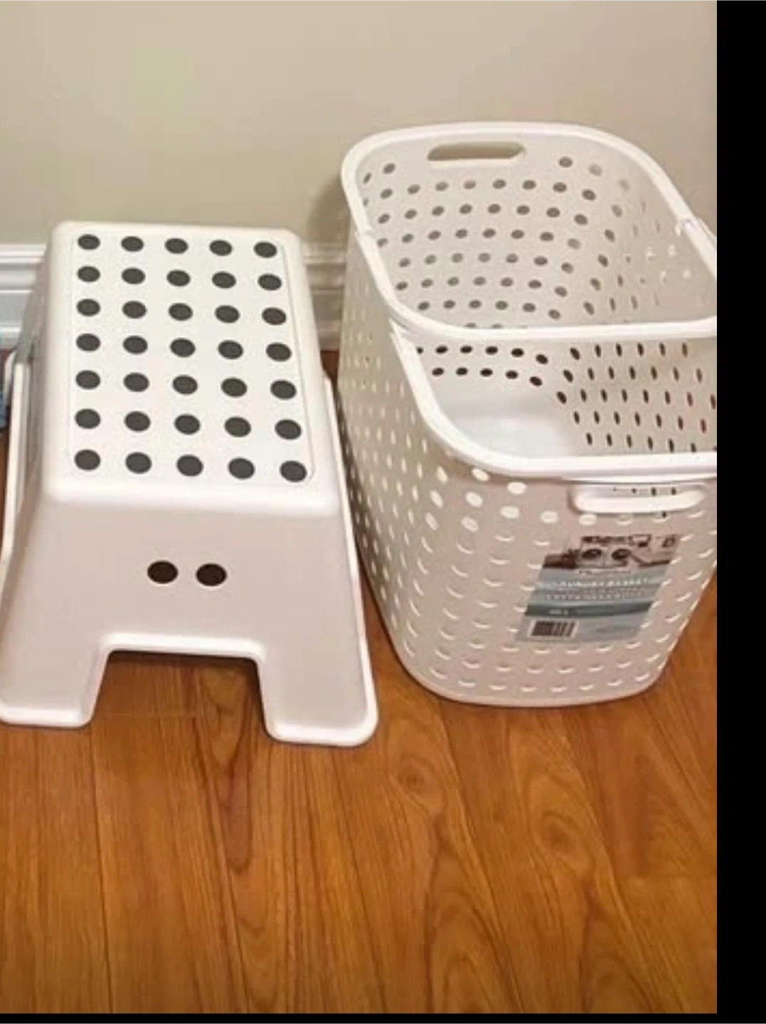A white plastic step stool with black grip dots. It's suitable for reaching higher shelves or as a small seat. Also included is a white perforated laundry basket with handles. The basket's dimensions are roughly 18 inches long, 12 inches wide, and 14 inches high.