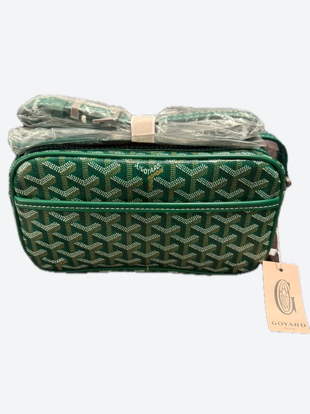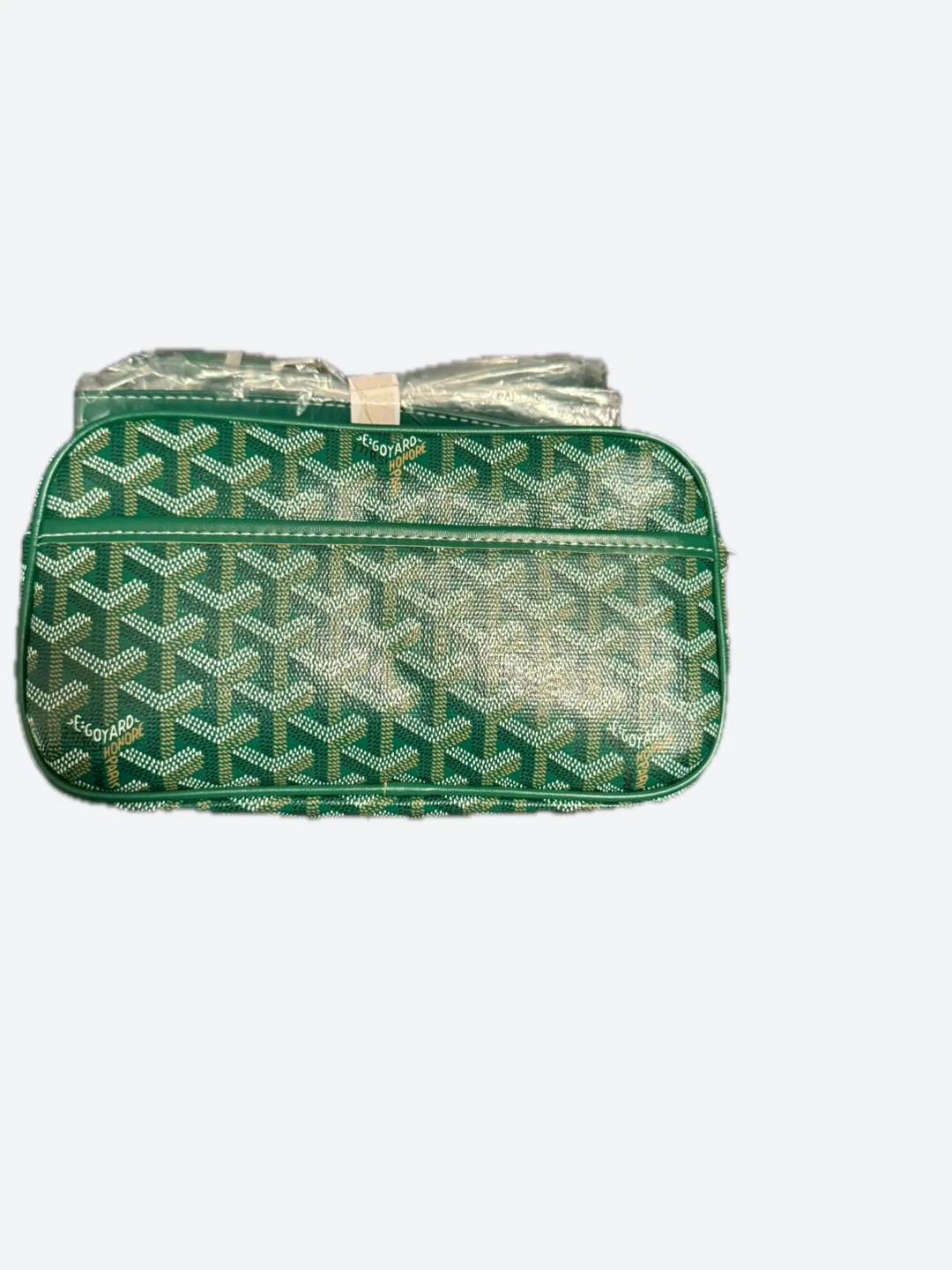A green Goyard crossbody bag with the signature monogram pattern. It comes with a removable strap and a dust bag. This bag is made of durable coated canvas.