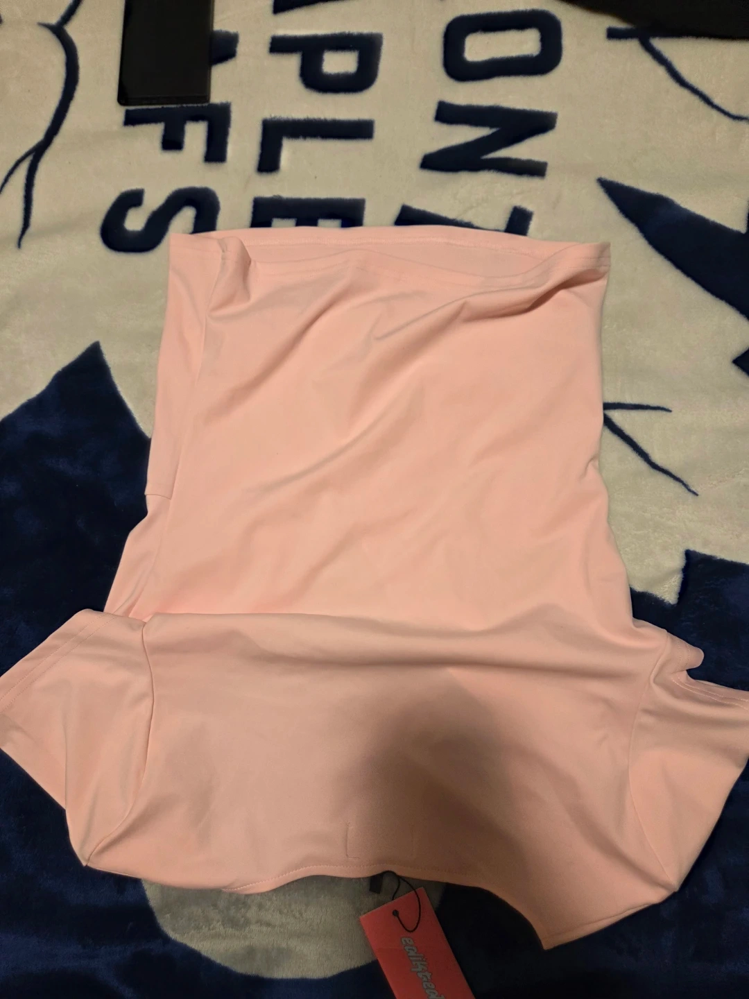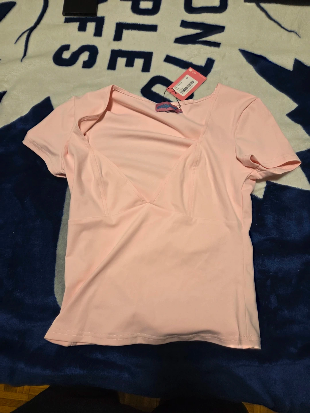 A short-sleeved, light pink t-shirt with a V-neckline. It's made of a stretchy material. This shirt would be great for casual wear.