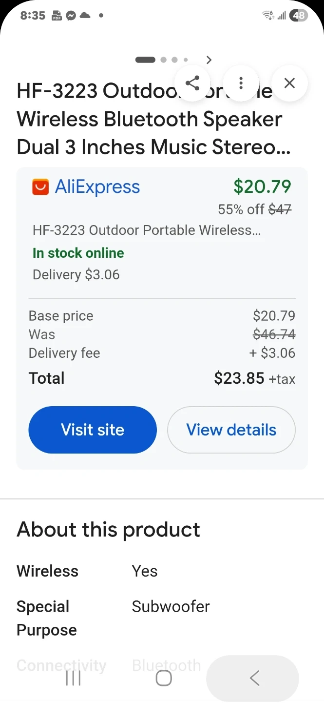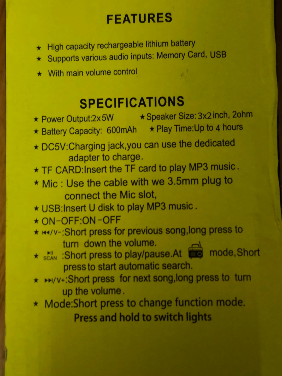 This portable speaker offers a high capacity rechargeable lithium battery and supports various audio inputs like Bluetooth Memory Card and USB. It features a dual 3-inch speaker size and can play for up to 4 hours. It's great for outdoor use!