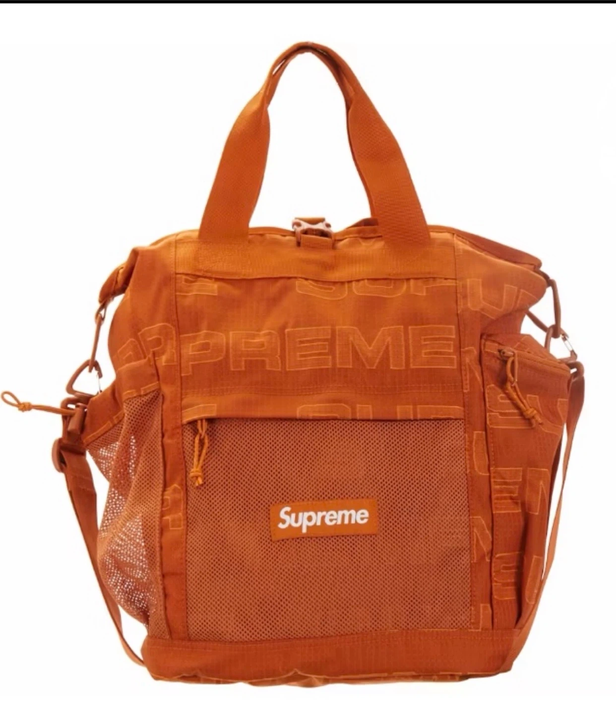 This is a Supreme duffle bag in orange. It features a mesh front pocket and textured Supreme branding throughout. Includes adjustable shoulder strap and top handles.
