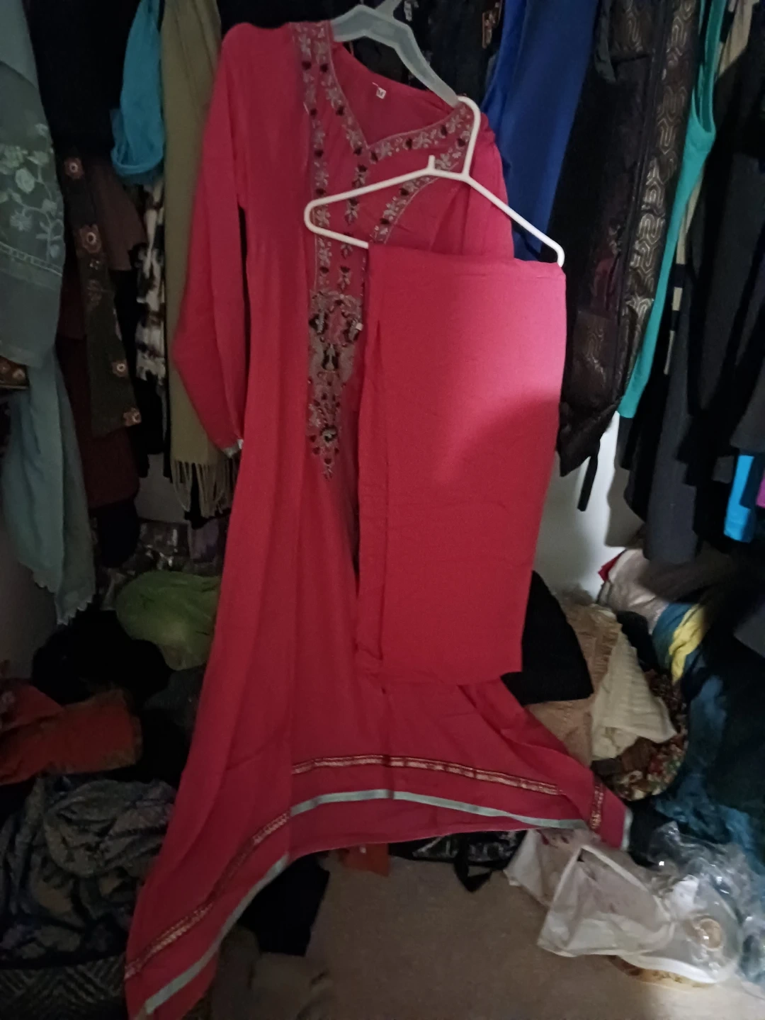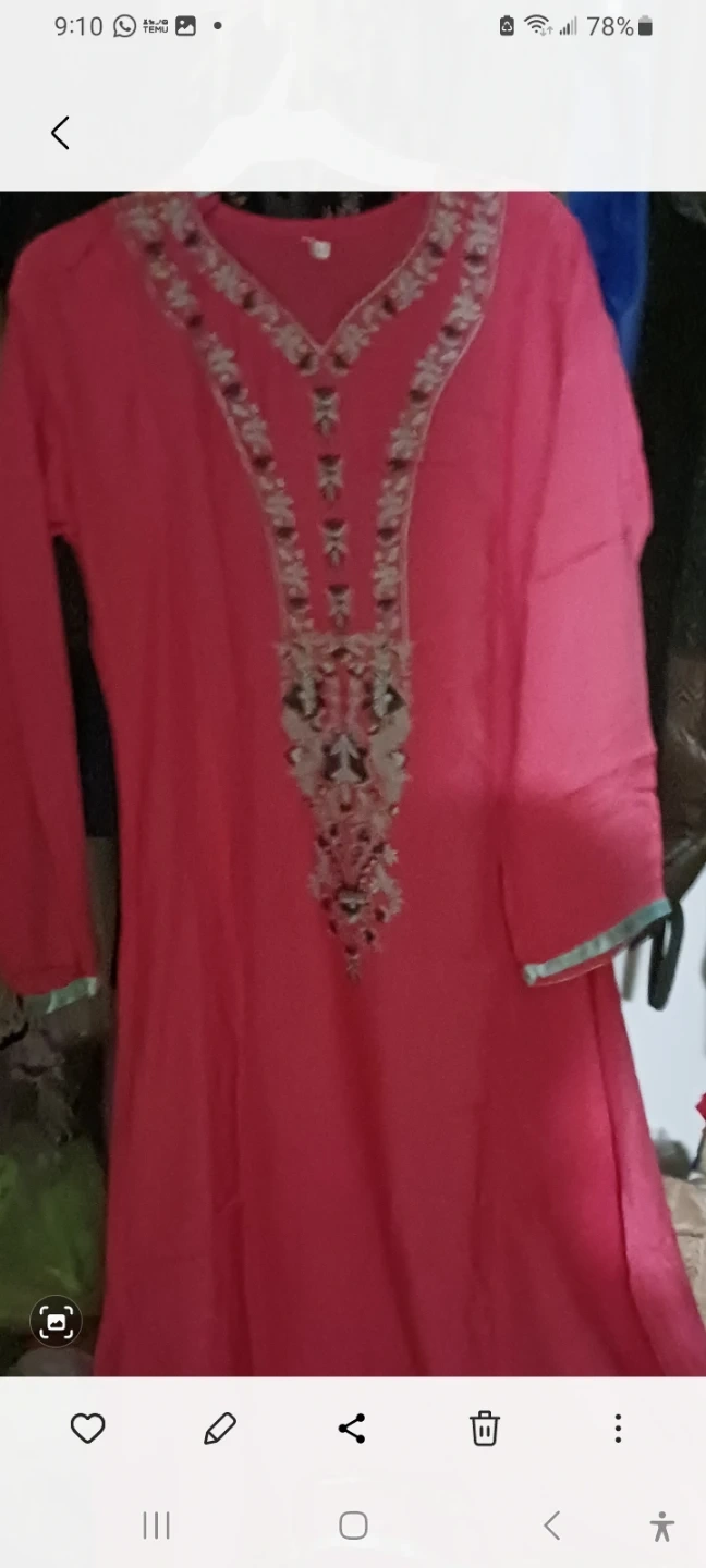 This is a pink kurti with embroidered details on the neckline and sleeves. It comes with matching pink pants. The fabric appears to be lightweight.