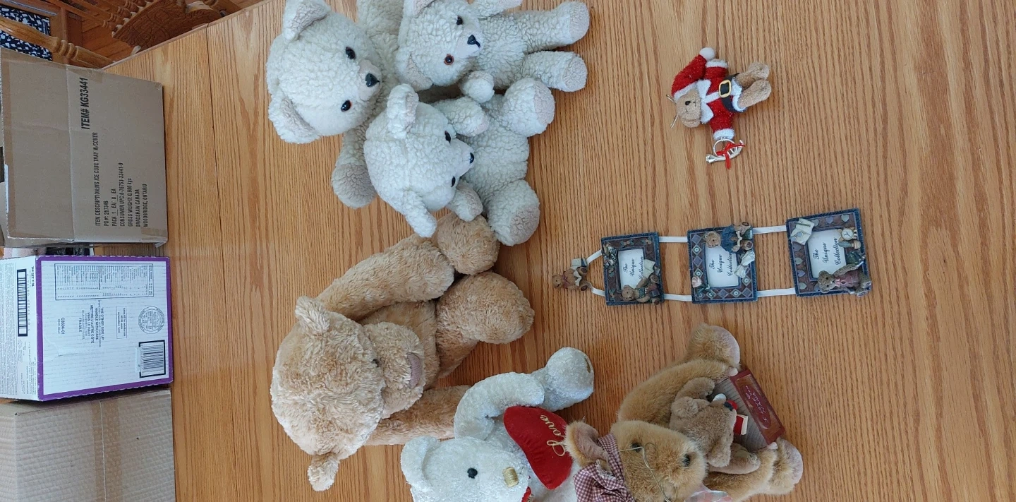 Collection of plush teddy bears in various sizes and colours. Includes a festive Santa teddy and a decorative keepsake photo frame with three small picture slots. Made with soft, durable materials.