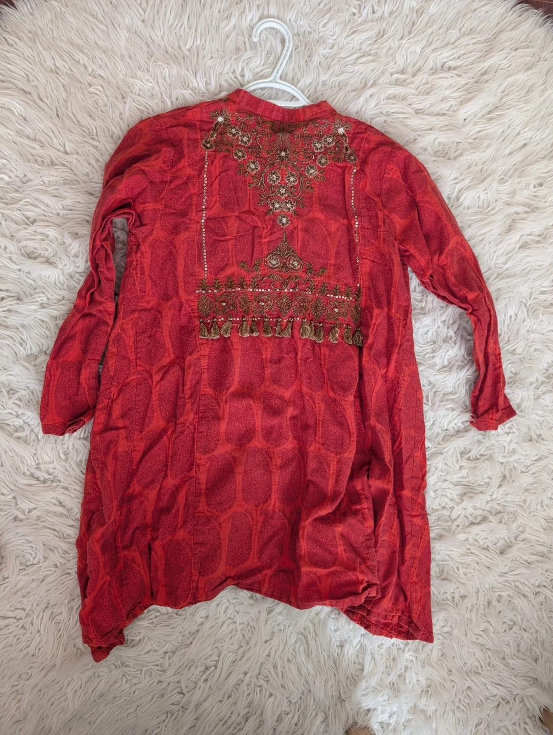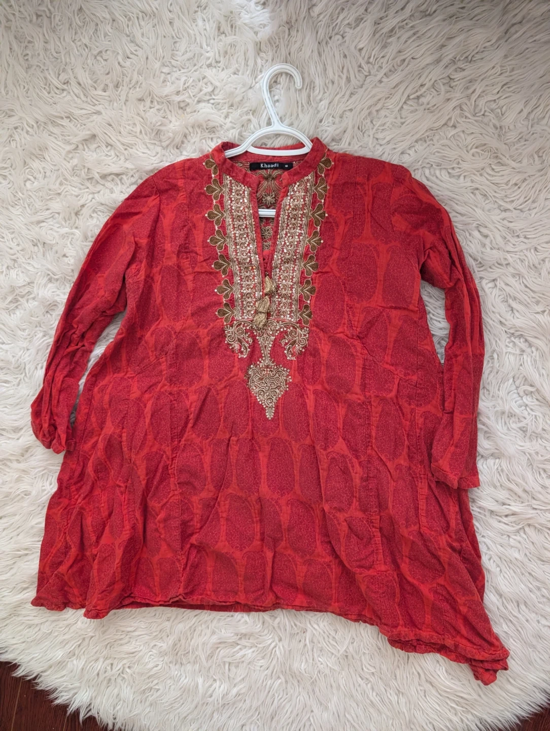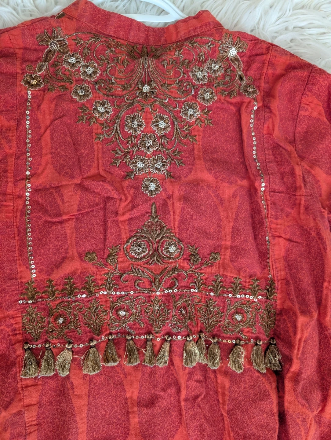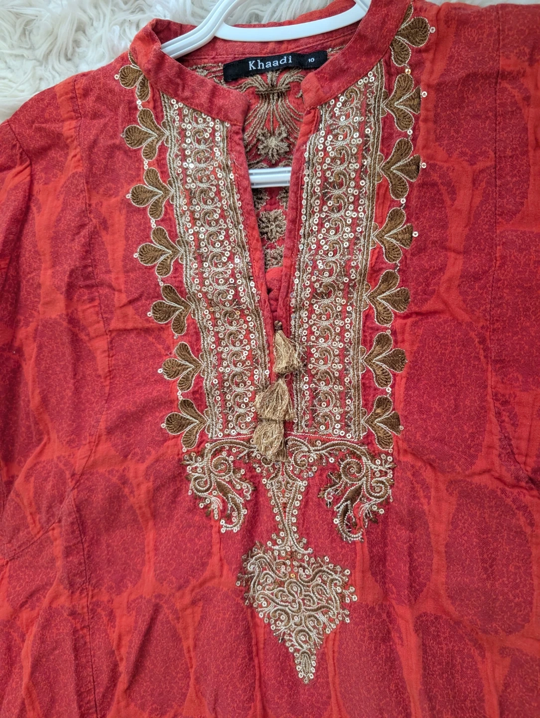 This Khaadi tunic is burnt orange with intricate gold and brown embroidery on the front and back. It features sparkly sequins and tassels for added detail. Size is 10. Adds a festive touch to any wardrobe!