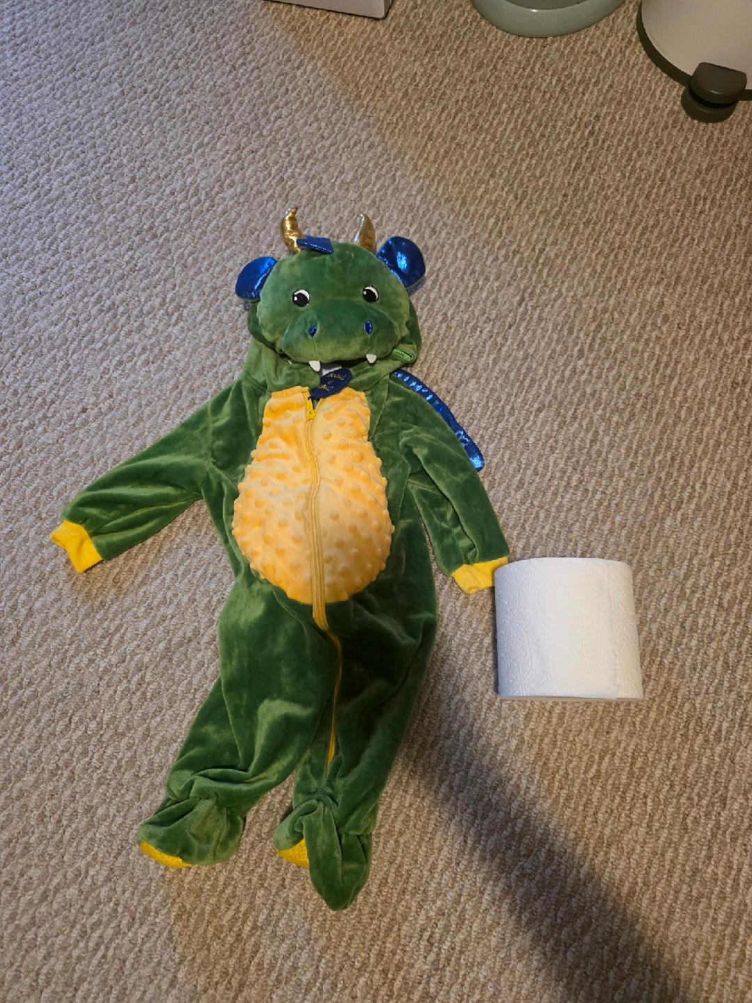 Selling a cute dragon costume, perfect for your little one! It's sized for 3-6 months. The costume is green with yellow accents and has a hood with dragon details. It's in great condition and ready for a new home!