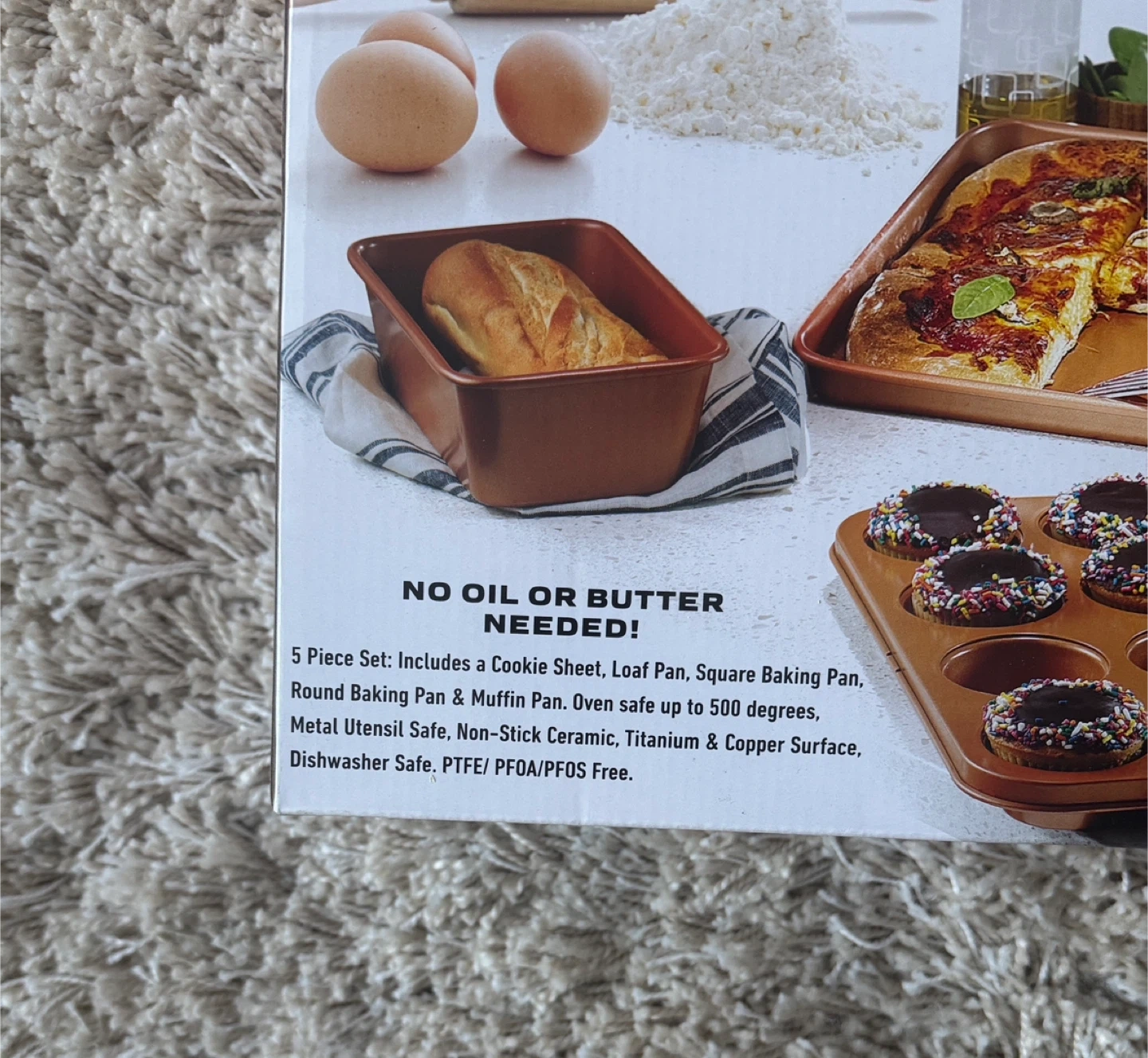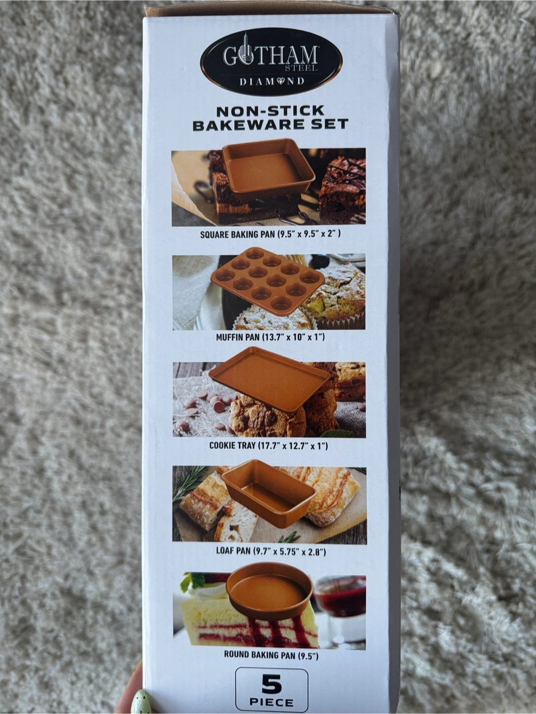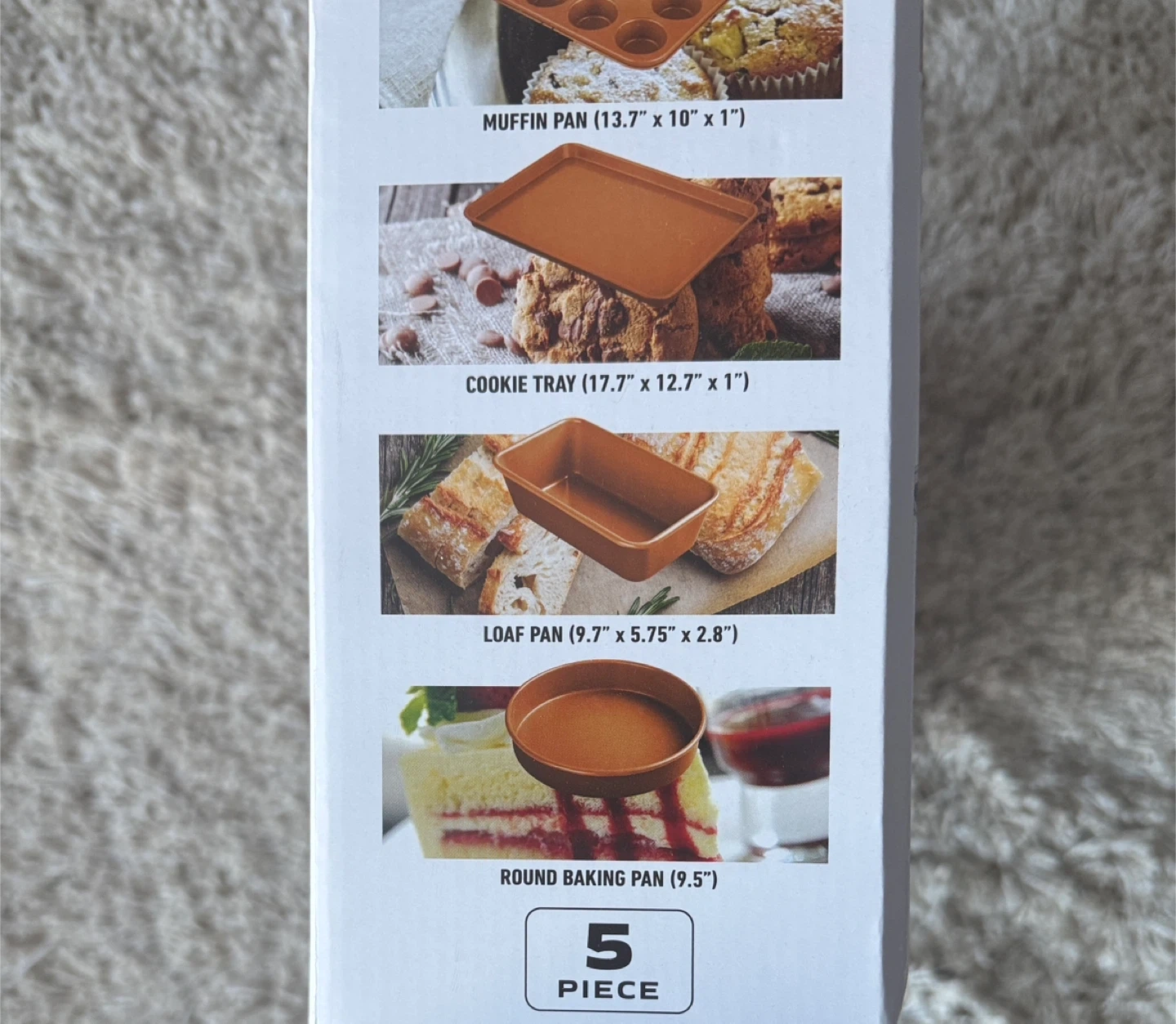 This 5-piece bakeware set includes a cookie sheet, loaf pan, square baking pan, round baking pan, and muffin pan.