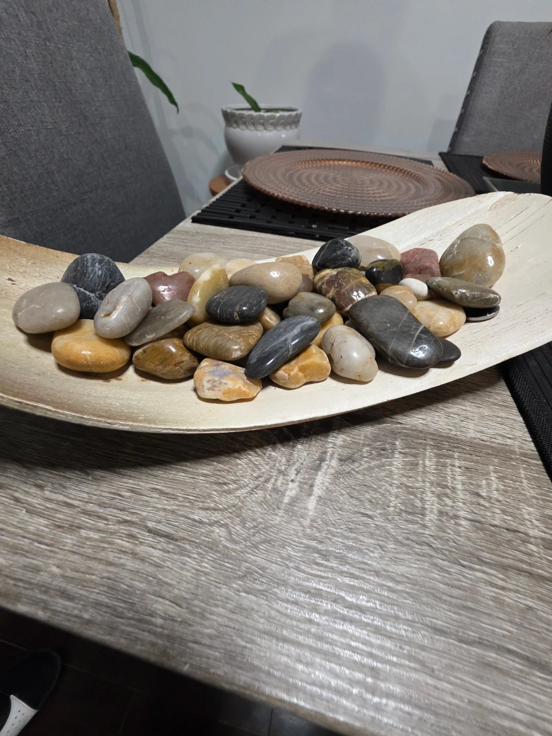 A collection of smooth, polished river stones displayed in a rustic wooden bowl. These stones offer a natural touch to any home decor. They can be used to fill vases, accent centrepieces, or create a calming zen garden display.