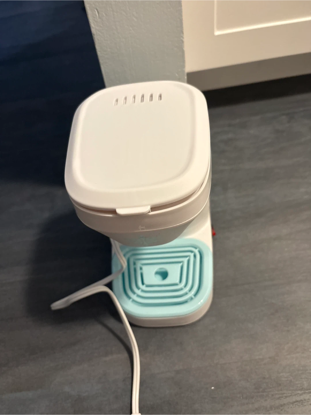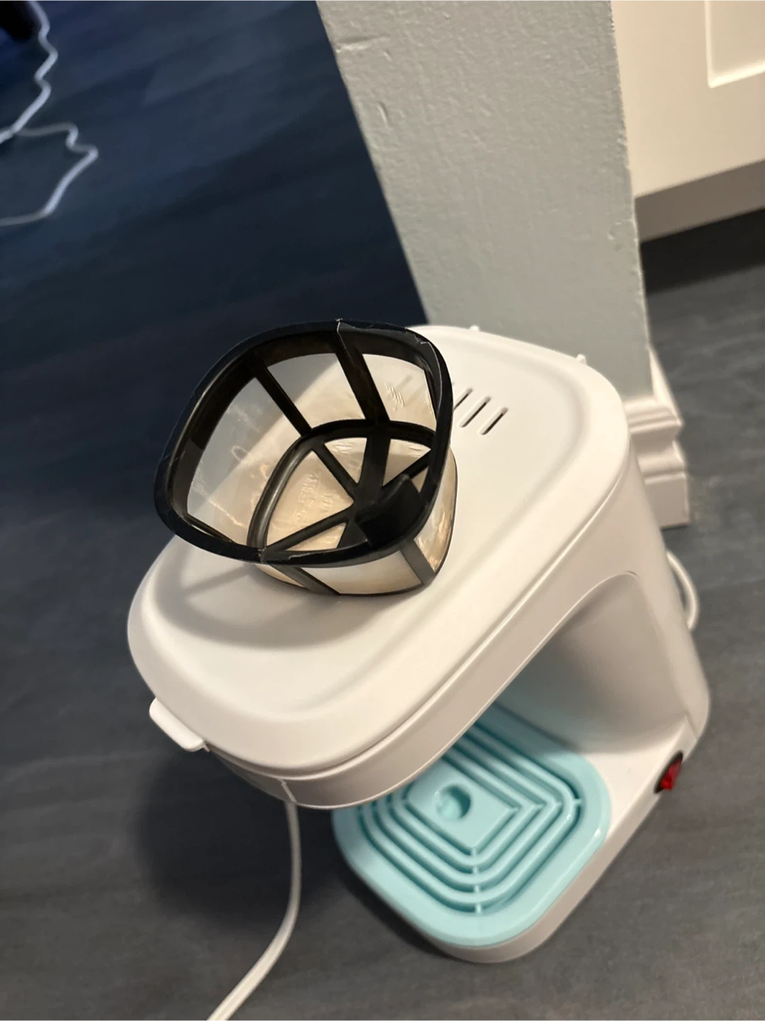 Compact single-serve coffee maker, perfect for a dorm room or small kitchen. It's white with aqua accents and includes a reusable filter basket. Easy to use and clean!