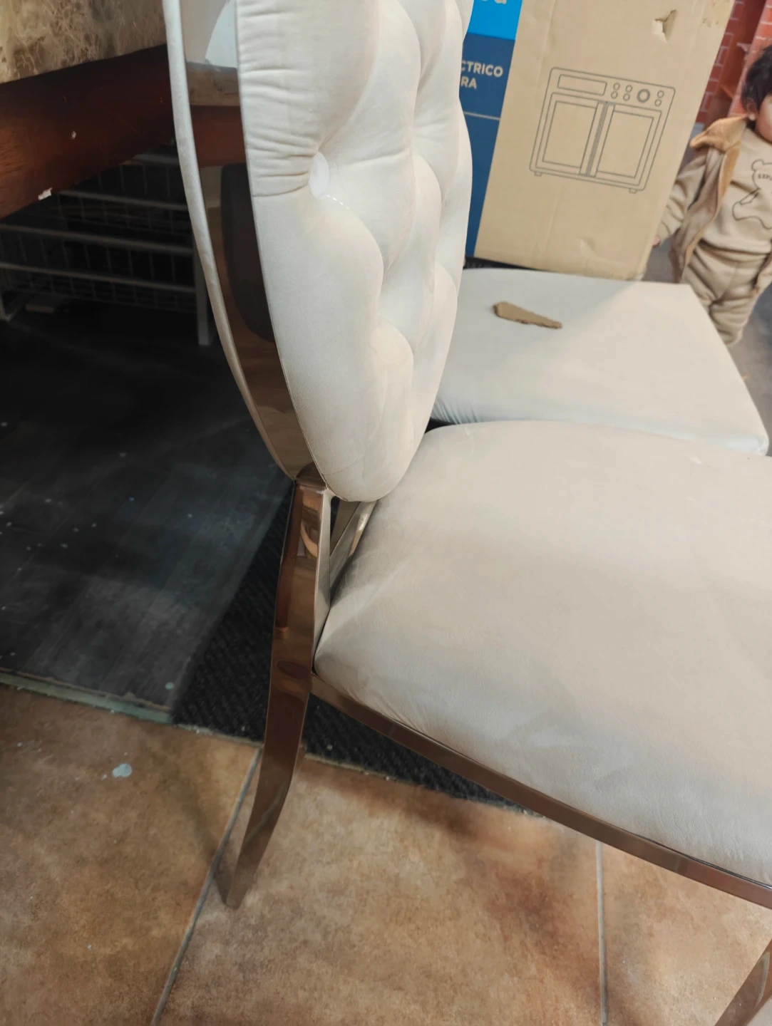 Brand New - These cream upholstered dining chairs feature a stylish tufted back design and sturdy metal legs. They're perfect for adding a touch of elegance to your dining room. The seat and back are cushioned for comfort.