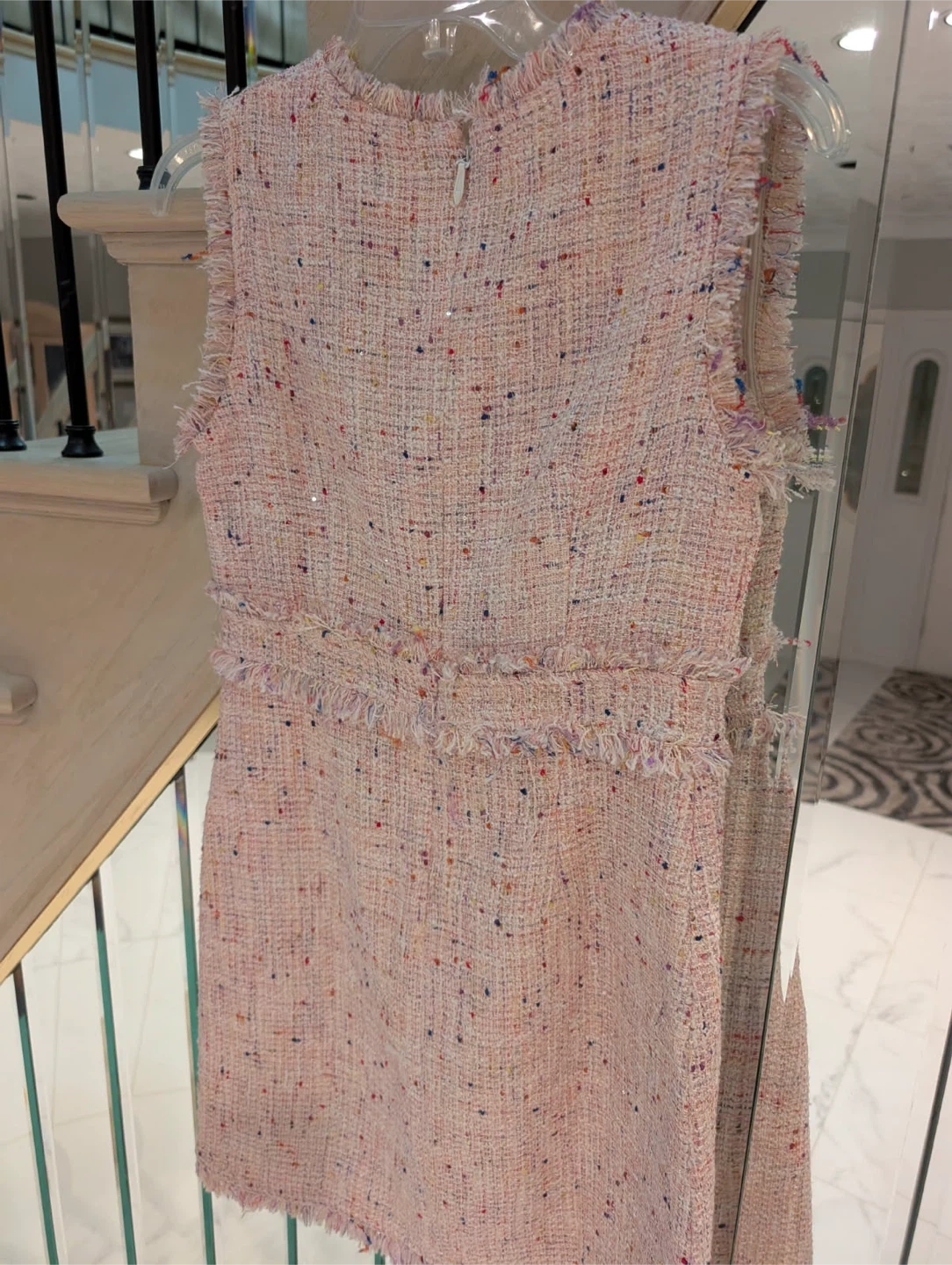 Pretty pink tweed sleeveless dress. Features a contrast ribbon bow with rhinestone embellishment at the neckline and frayed trim details. Material is a textured blend, perfect for a stylish look.