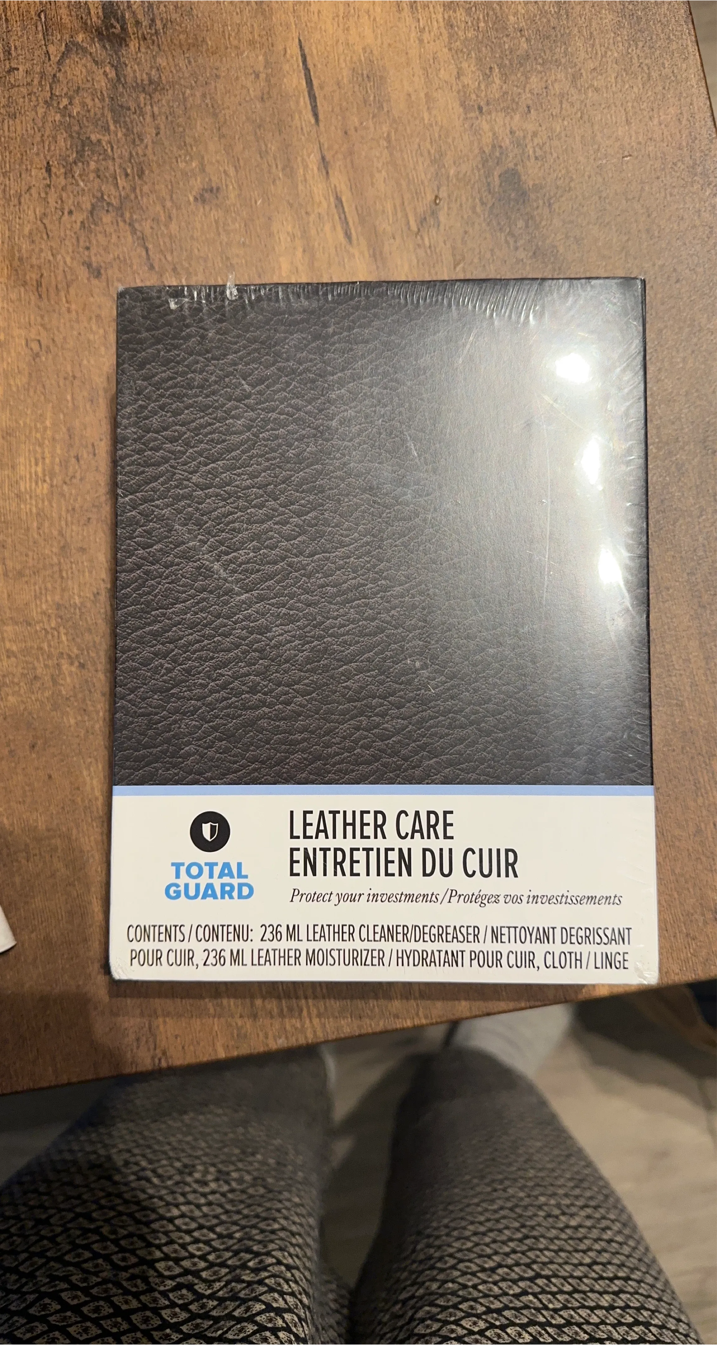 Selling a Total Guard leather care kit! This includes 236 mL of leather cleaner/degreaser and 236 mL of leather moisturizer. Keep your leather goods in great shape with this kit