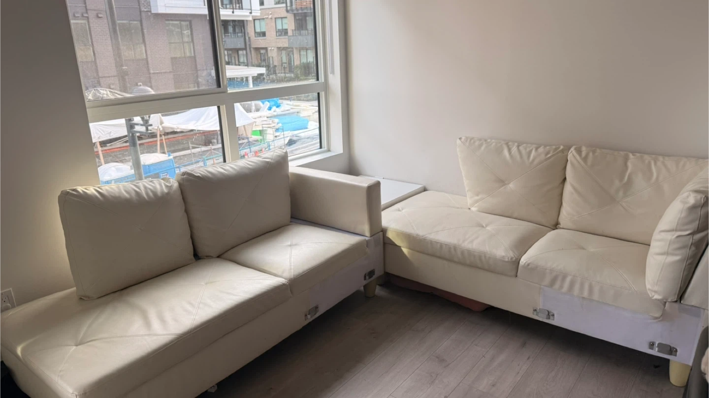 L shape couch. Plus one extra couch of same design. Can be altered in various ways according to the design of your space. White faux leather is easy to clean mess. Couch has a good firmness and comfy and elegant with the way you present it. I took the pics in a hurry and couldn’t do justice to the pic. However, you will be lucky to have it in your space as it is enriched with elegance.