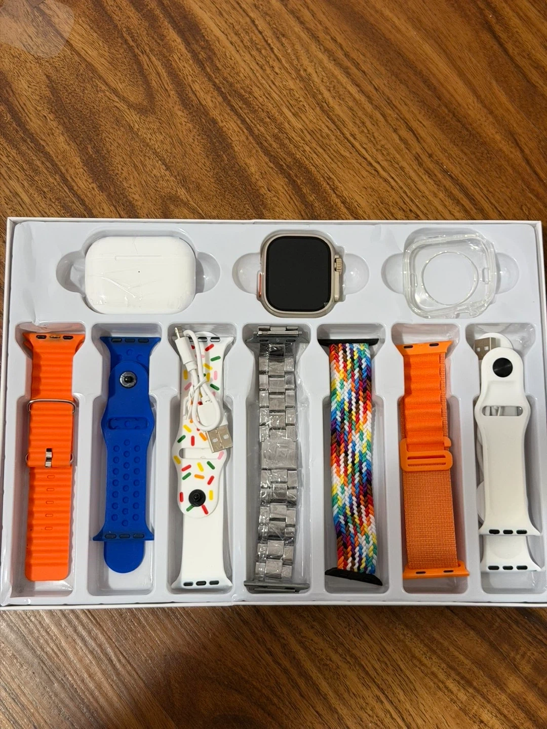 This bundle includes a smartwatch with an orange band and a pair of wireless earbuds with a charging case. It also comes with multiple interchangeable watch bands in various colours and designs, plus a protective watch case. All components are neatly packaged.