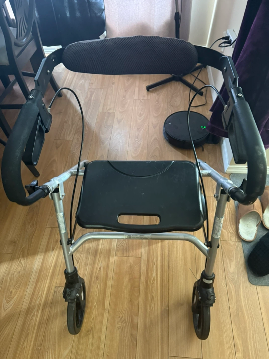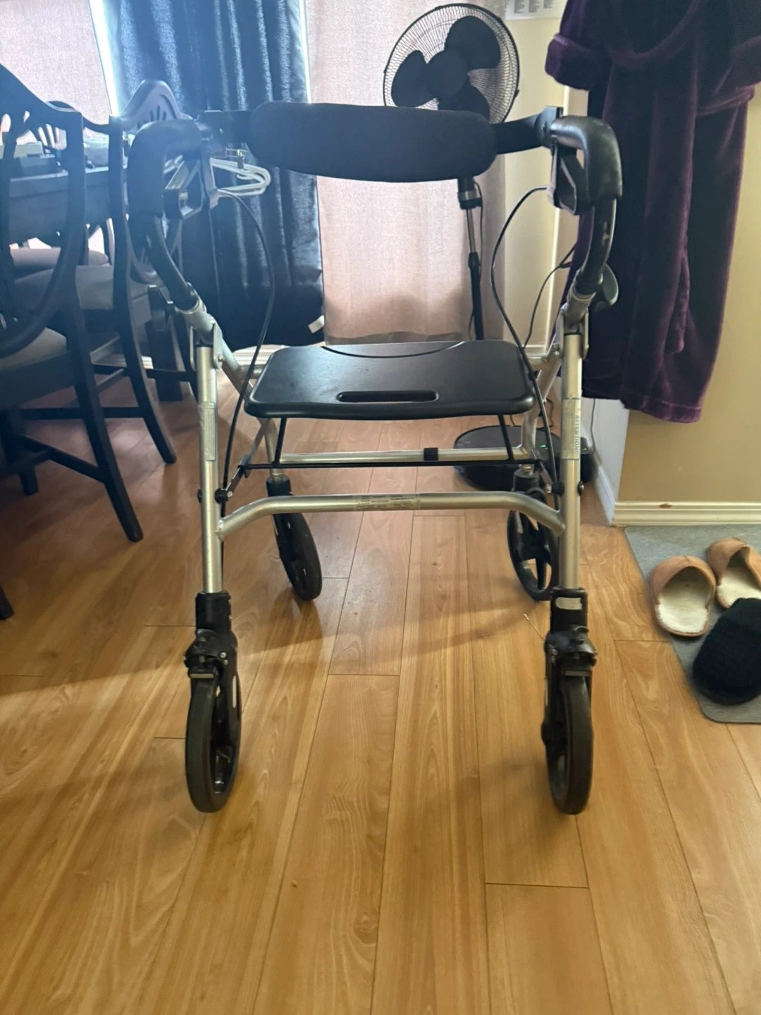 This ProDeg3 Walkers rollator is silver with black seating and handles. It has four wheels, a seat, and brakes. It's designed for mobility assistance.