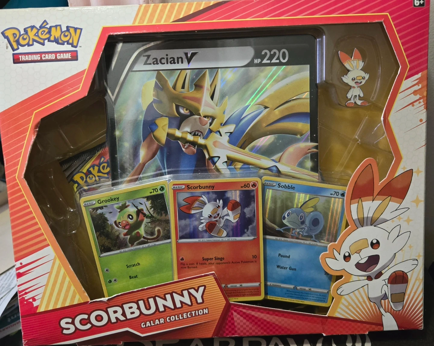 This Pokemon Galar Collection box features Zacian V and includes several trading cards like Grookey, Scorbunny, and Sobble. It's suitable for players aged 6 and up.