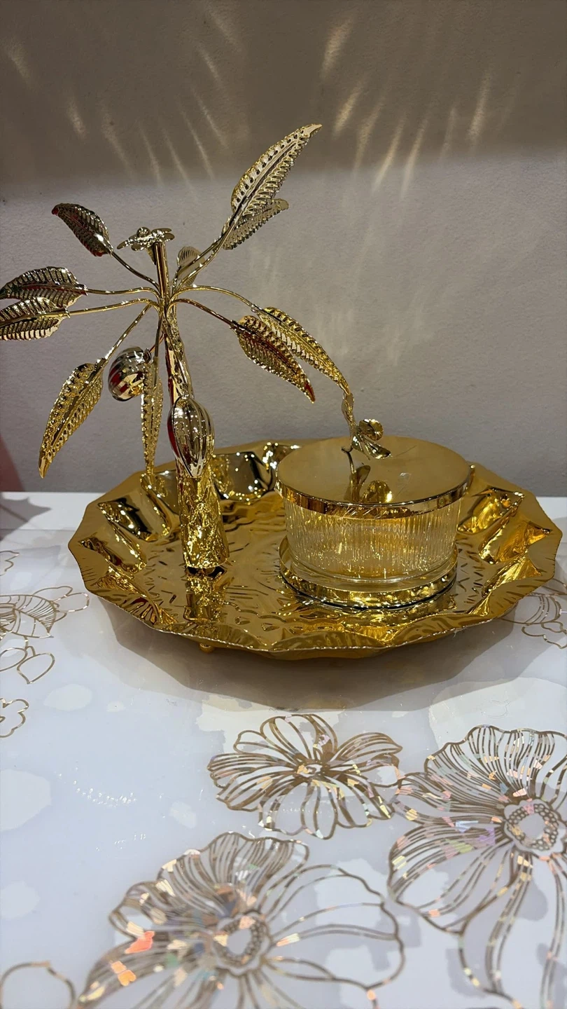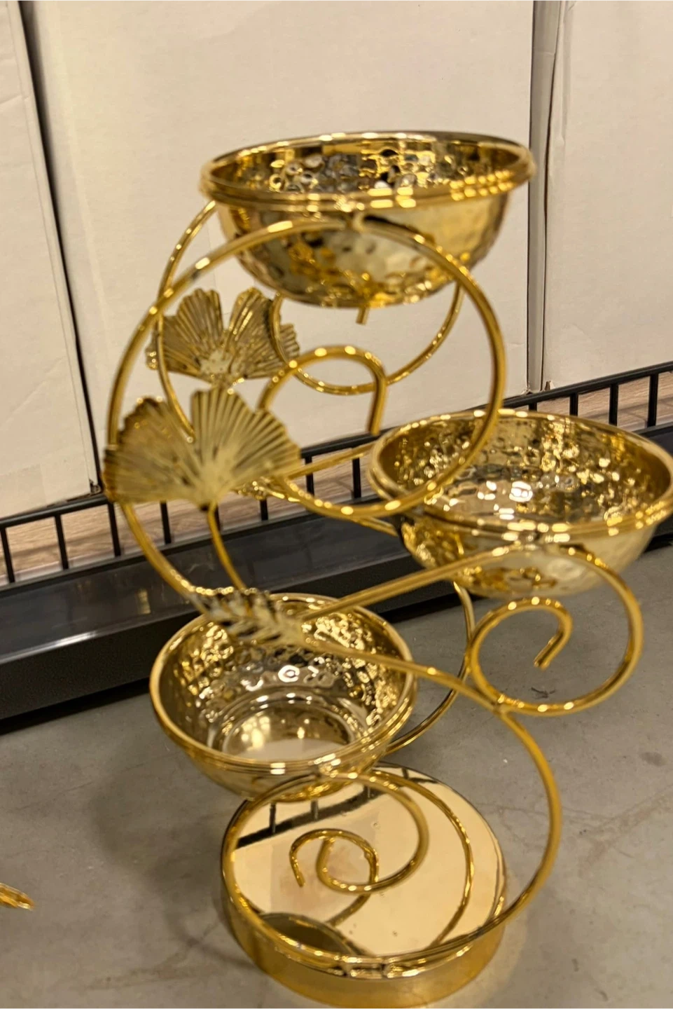 Gold Tiered Serving Tray with Decorative Ginkgo Leaves