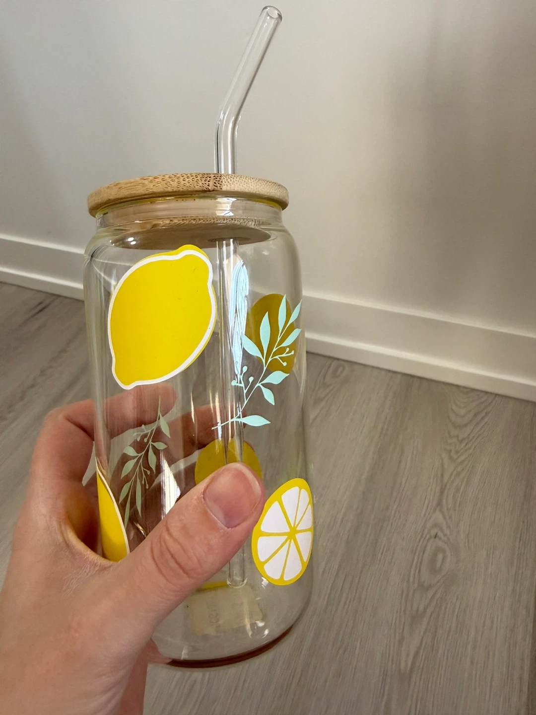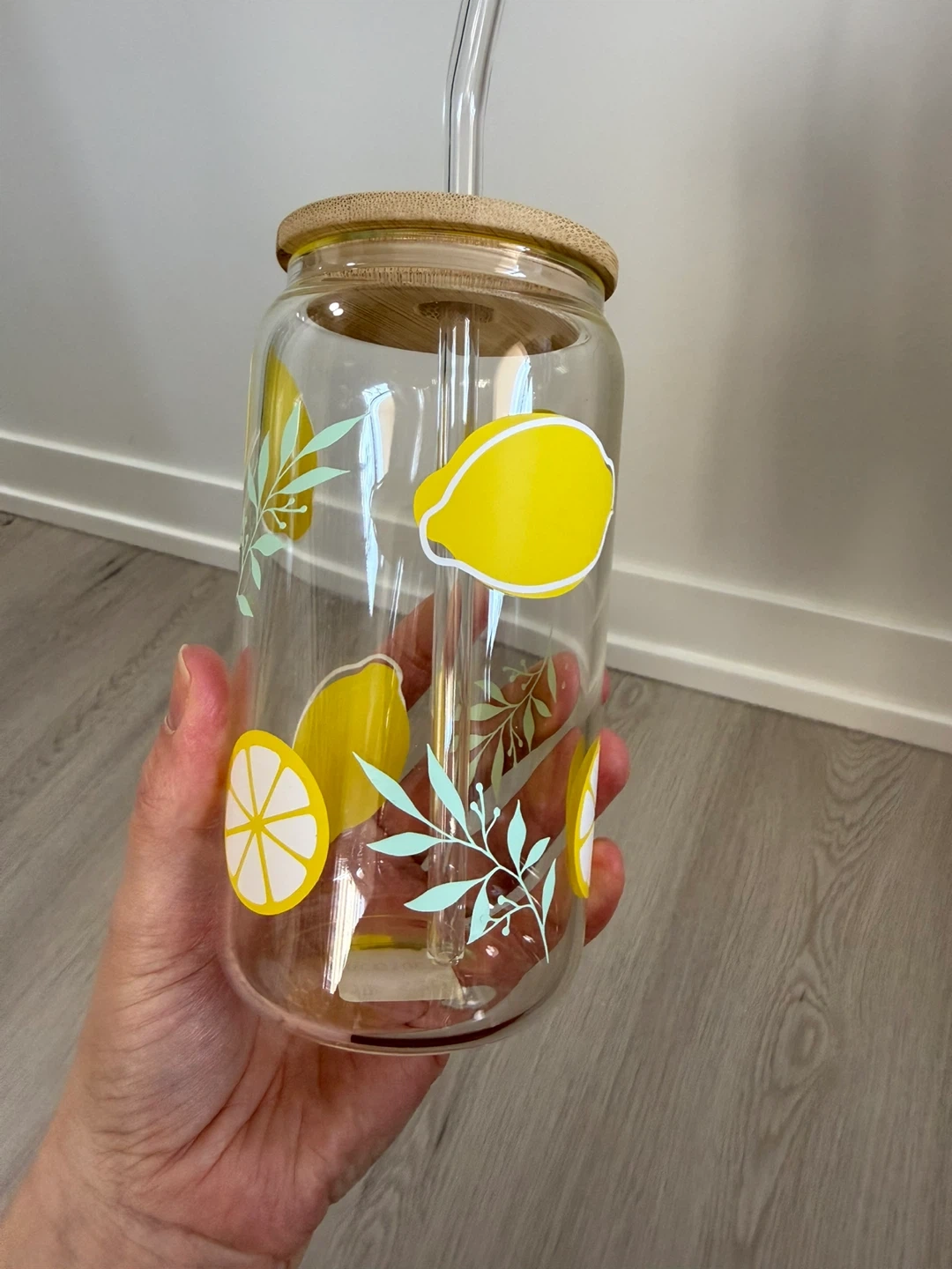 Brand new! Got this at a craft show and never ended up using it. Glass cup with bamboo lid and glass straw. Handwash gently. Meant for cold drinks like iced coffees, etc. smoke free home.