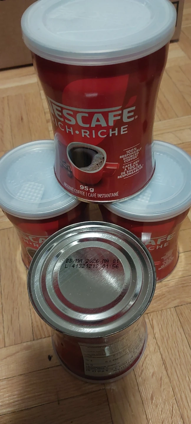 Three cans of Nescafé Rich Aroma instant coffee. Each can contains 95g of 100% responsibly sourced roasted coffee. BB-MA 2026 MA 01.