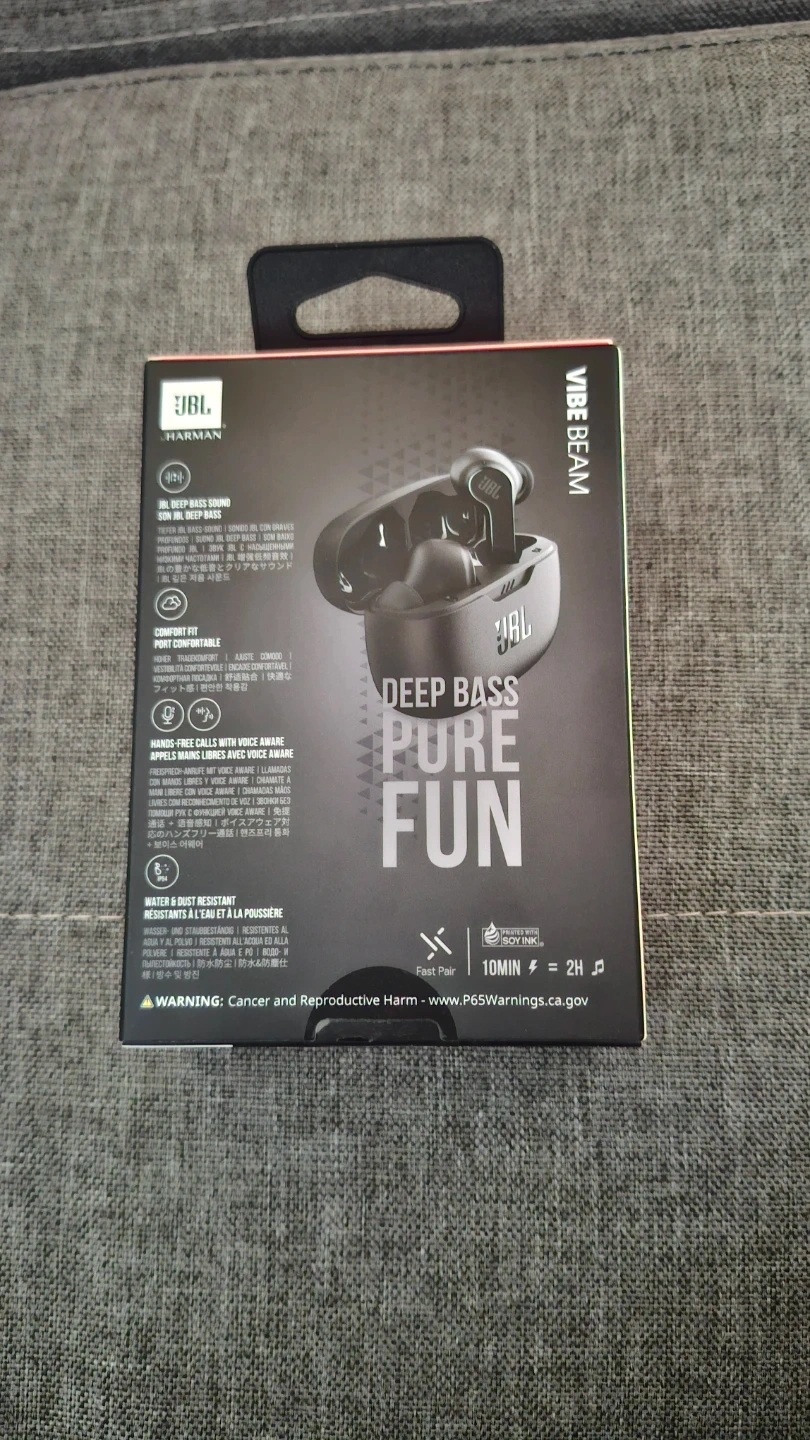 JBL Vibe Beam true wireless earbuds with deep bass sound. They're black and feature hands-free calls and custom touch control. Includes USB Type-C charging.